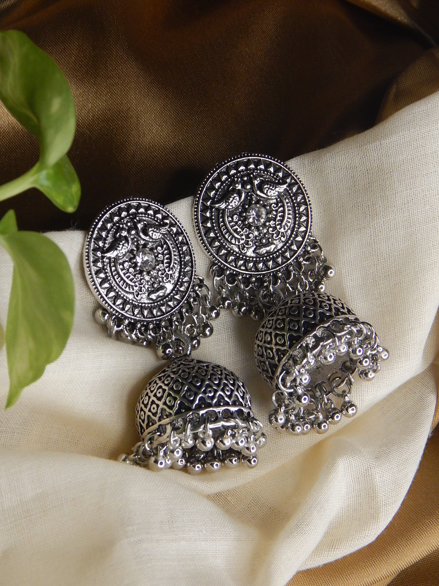 The antique Oxidised Jhumkas bring traditional artistry alive with embossed antique silver motifs and dome-shaped jhumkas. Enhanced with silver ghungroo hangings, they’re a statement for any festive look.