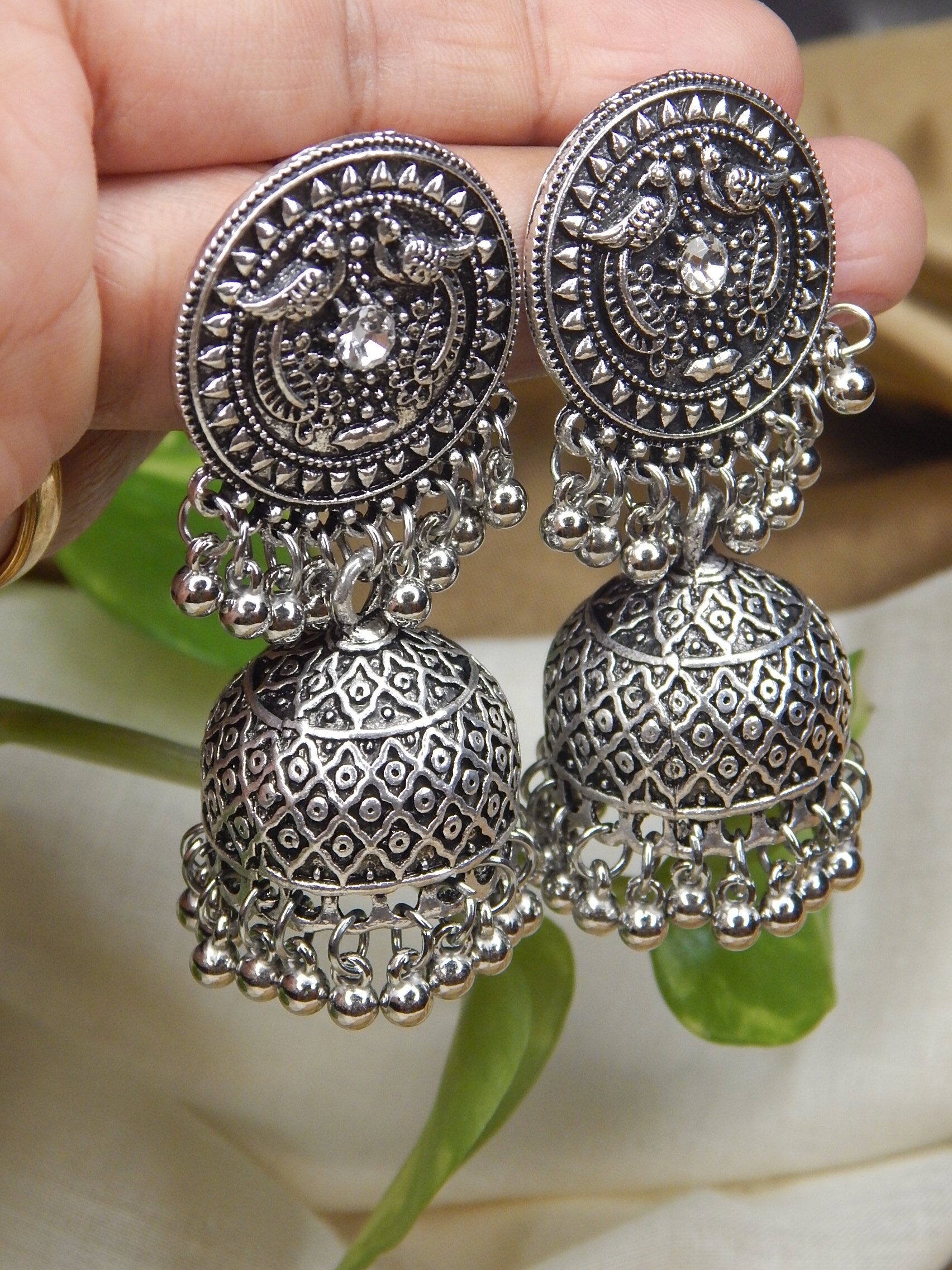 Antique oxidised jhumkas with ghungroo drops.