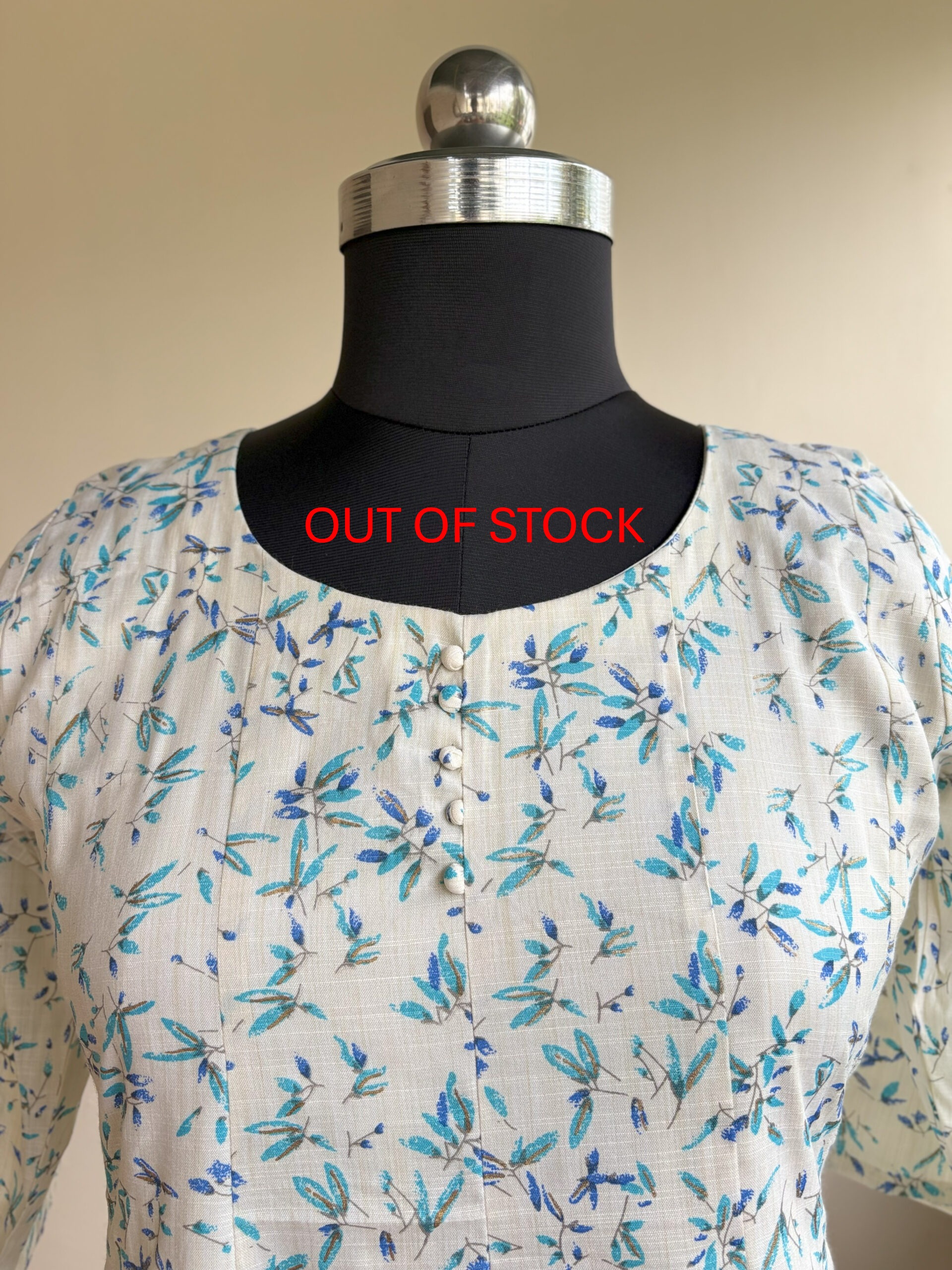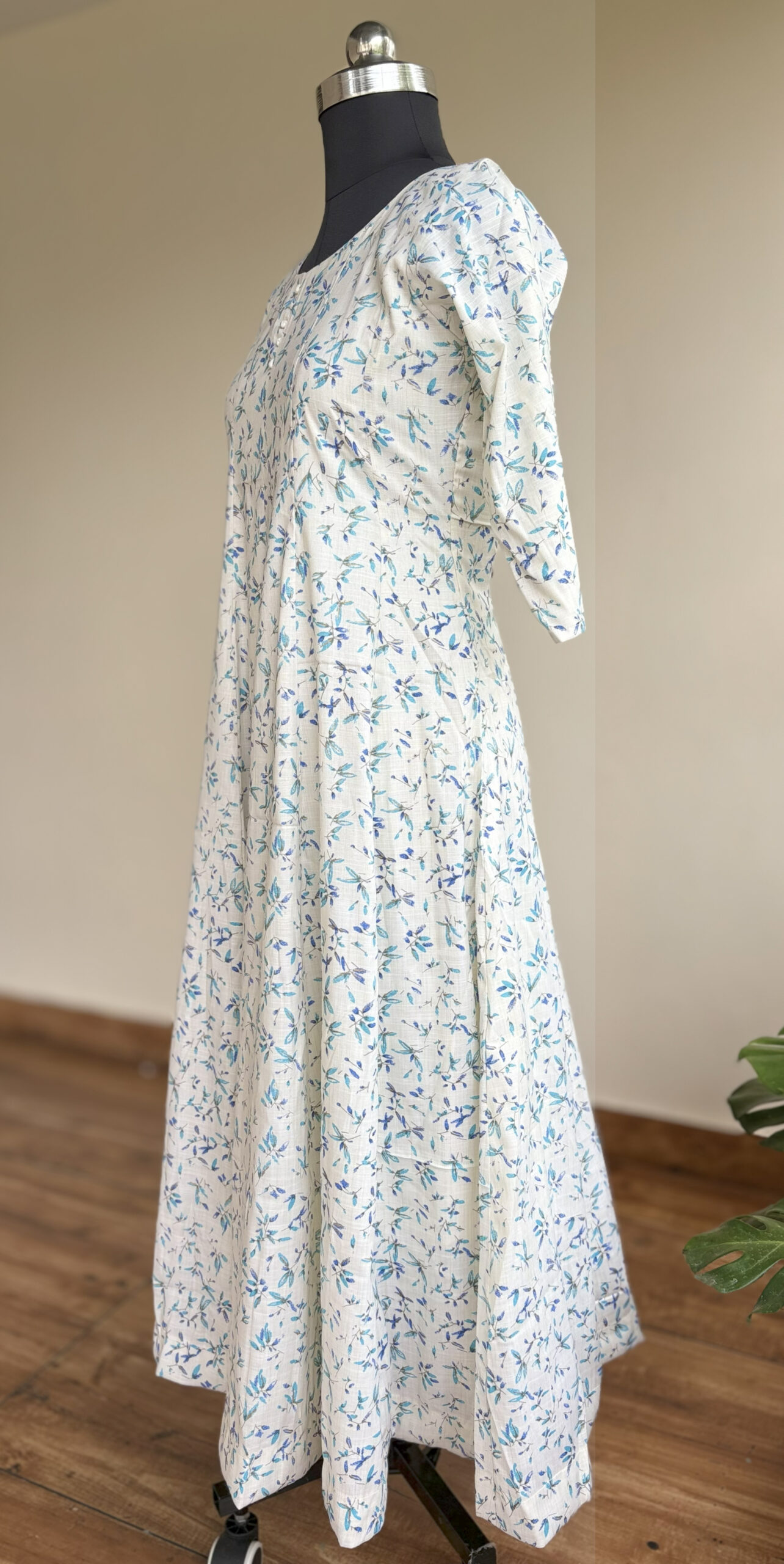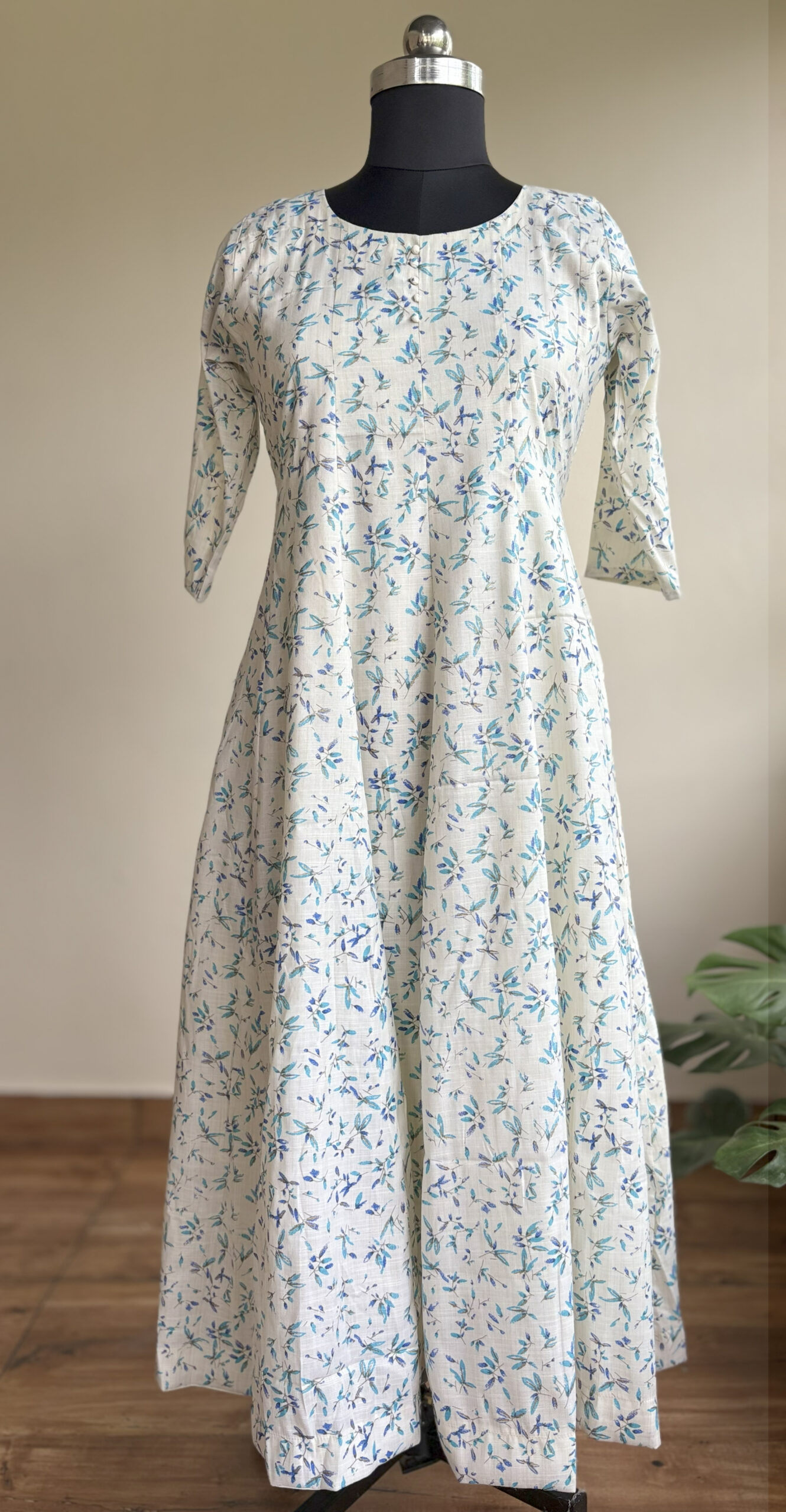 Refreshing off-white cotton kurti with sky-blue floral motifs. Perfect for a breezy, elegant look.