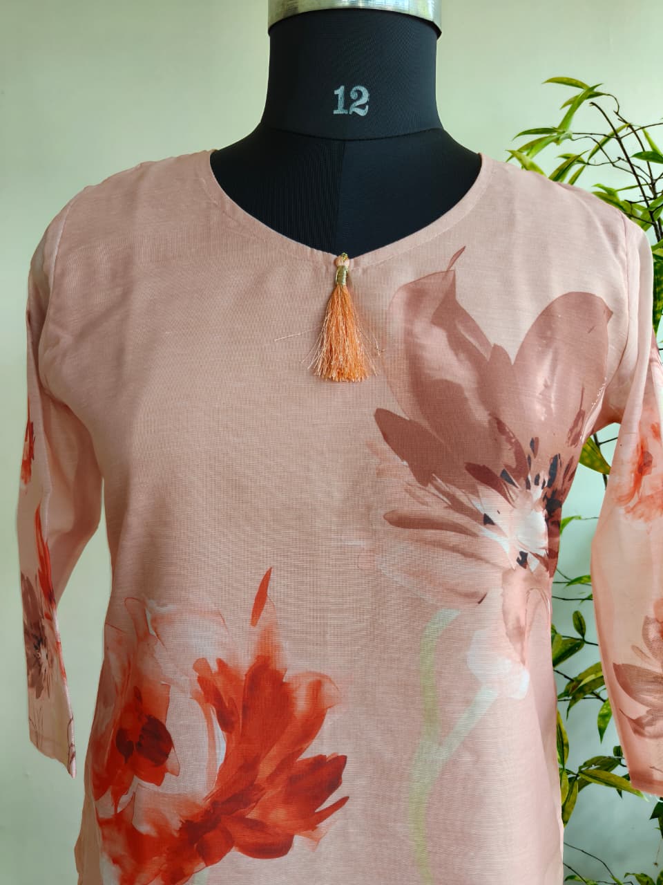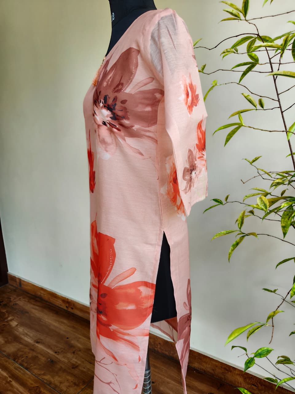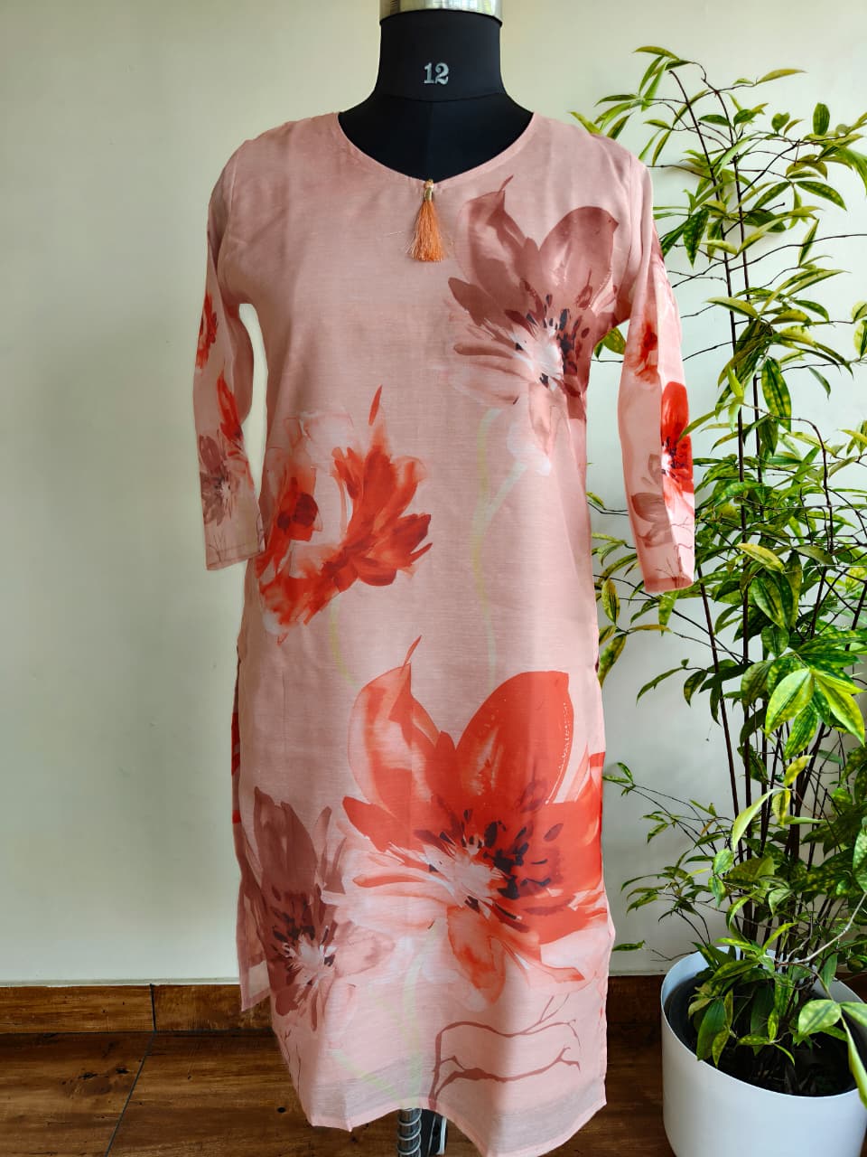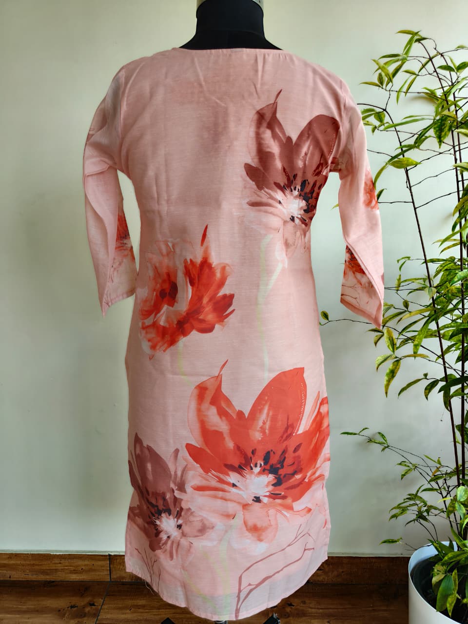 Buy this blush floral Chanderi cotton kurti for women with inner lining. Lightweight, breathable ethnic wear perfect for office and casual outings. Available at ₹499.