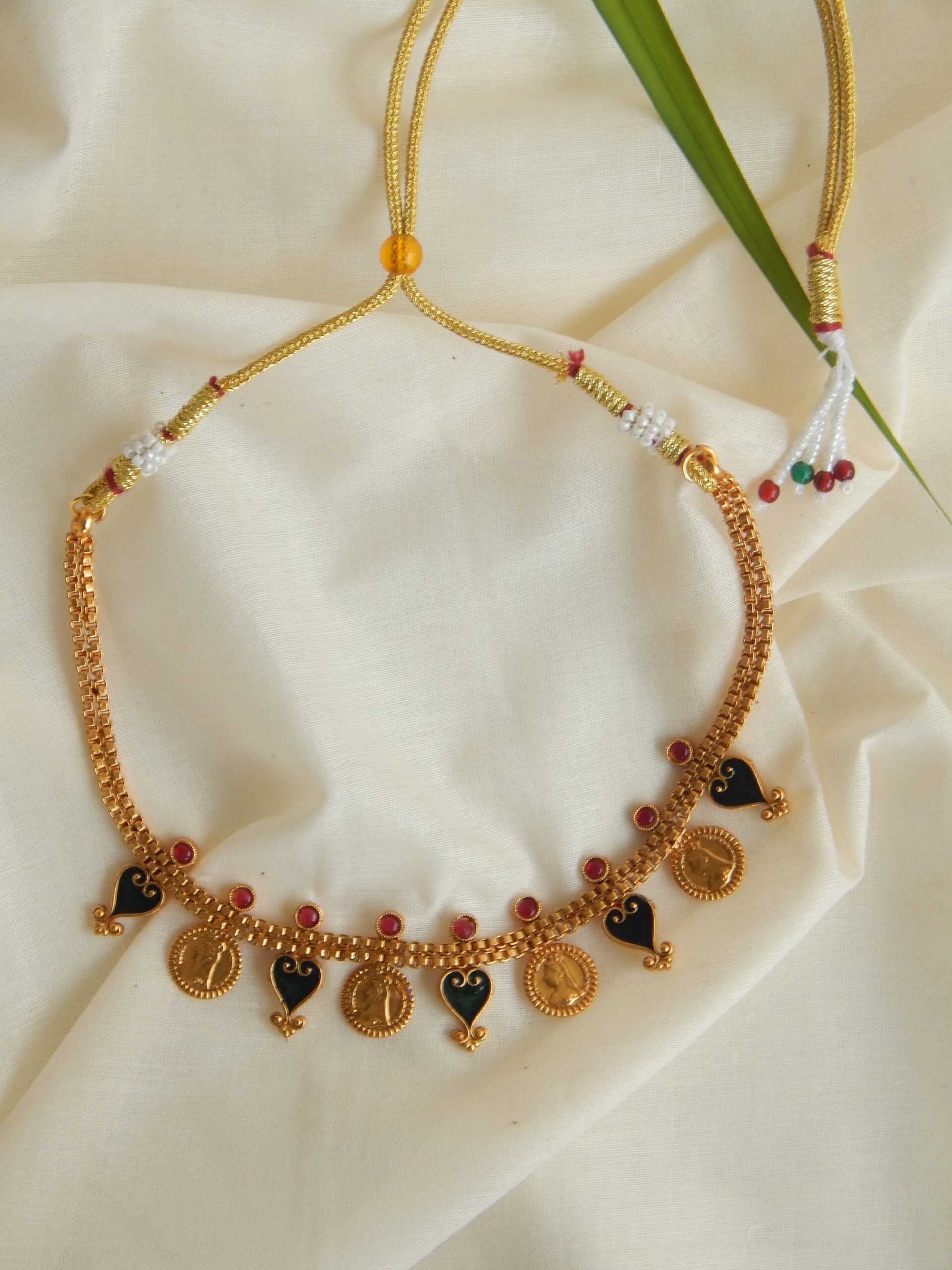 A charming necklace featuring heart palakka and coin motifs with antique gold detailing and ruby accents.