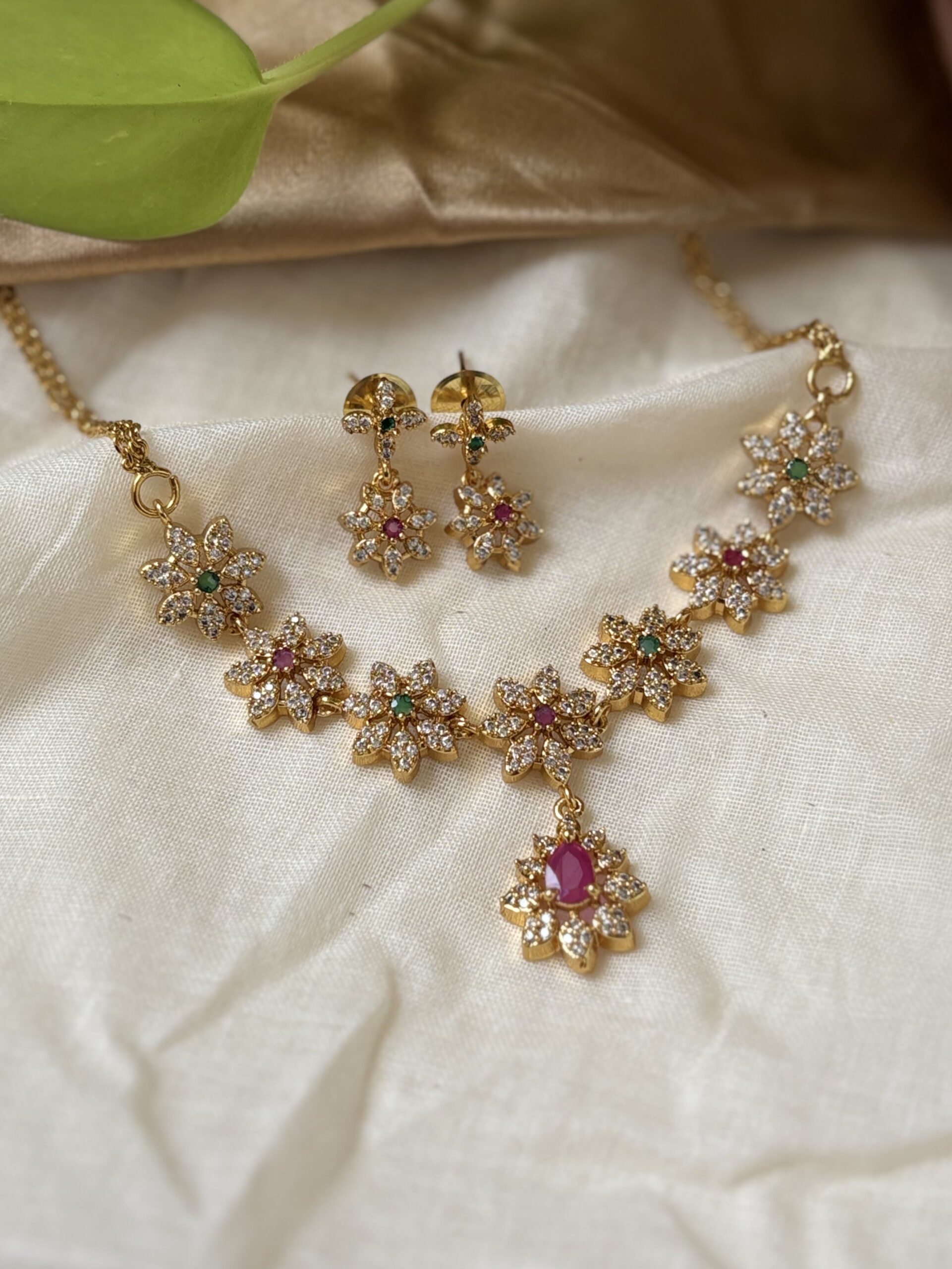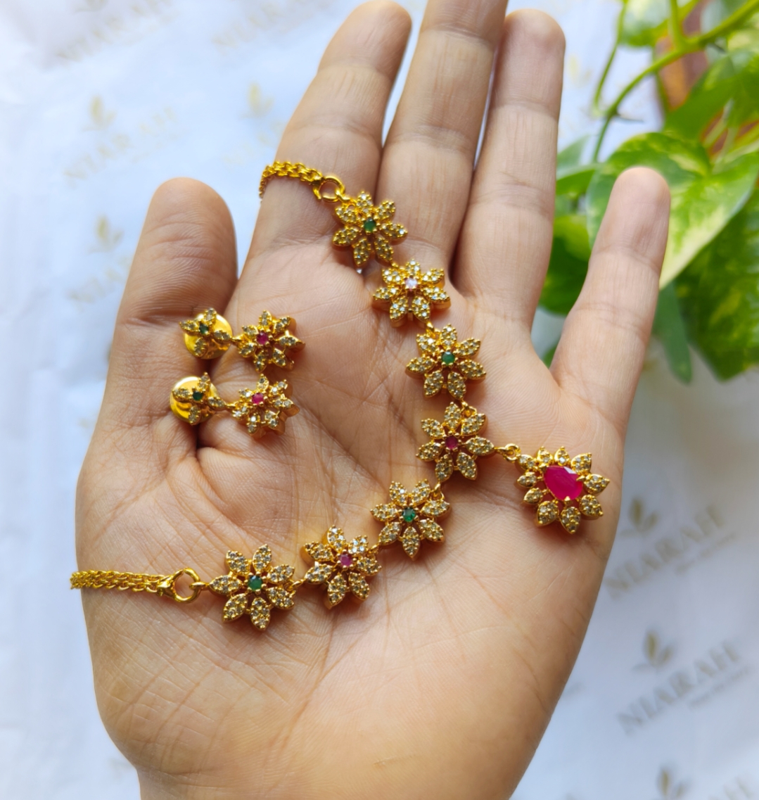 This stunning diamond-look floral necklace set is designed to give you the brilliance of fine jewellery at an unbelievably affordable price. Featuring intricate floral motifs studded with sparkling stones and subtle green accents, the design is elevated with a graceful pink drop pendant that adds a touch of elegance.