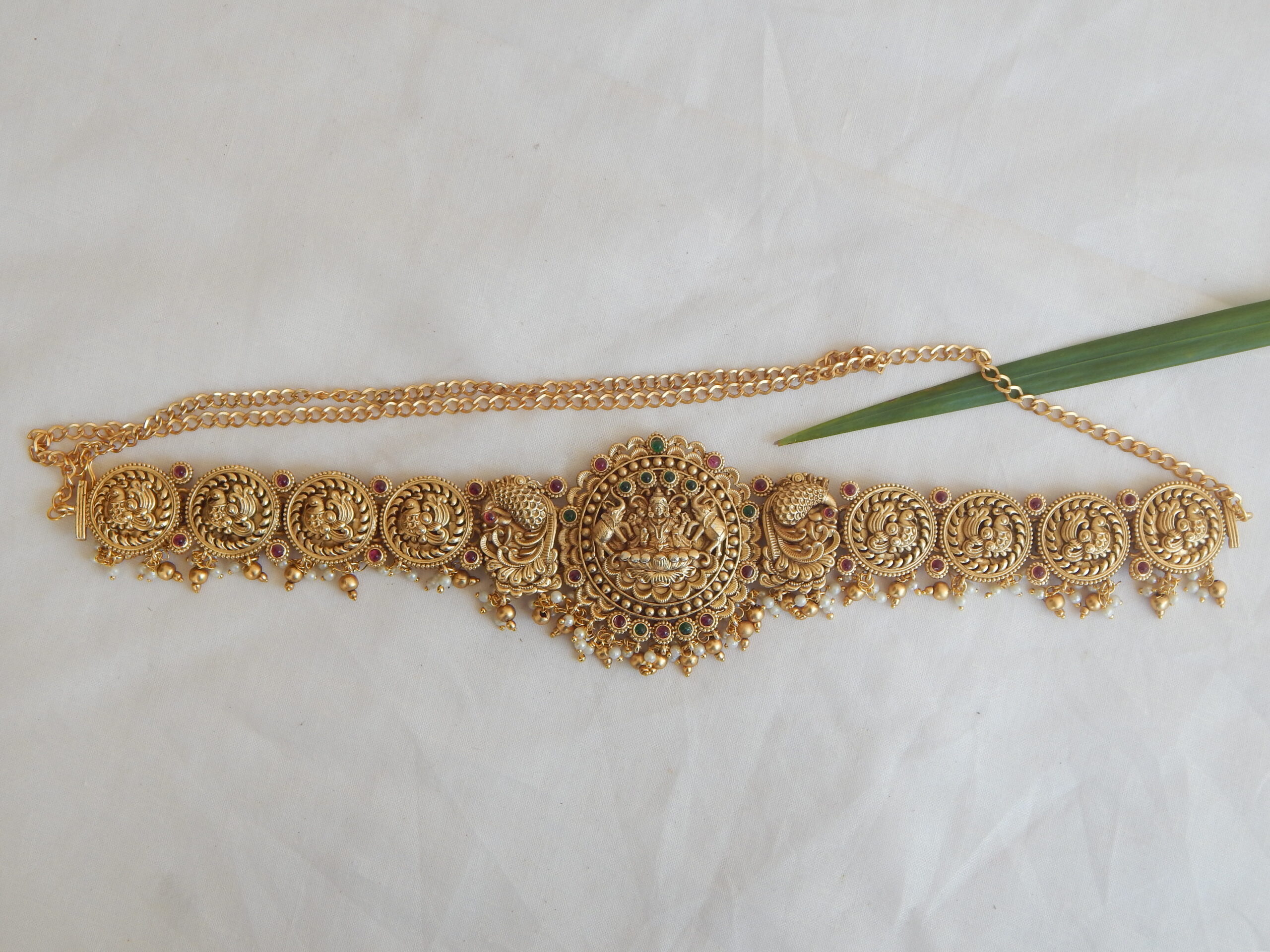 This antique gold-finish waist belt features goddess Lakshmi at the center with intricate temple carvings, ruby-emerald detailing, and hanging gold beads. A divine choice for brides, festivals, and temple occasions.