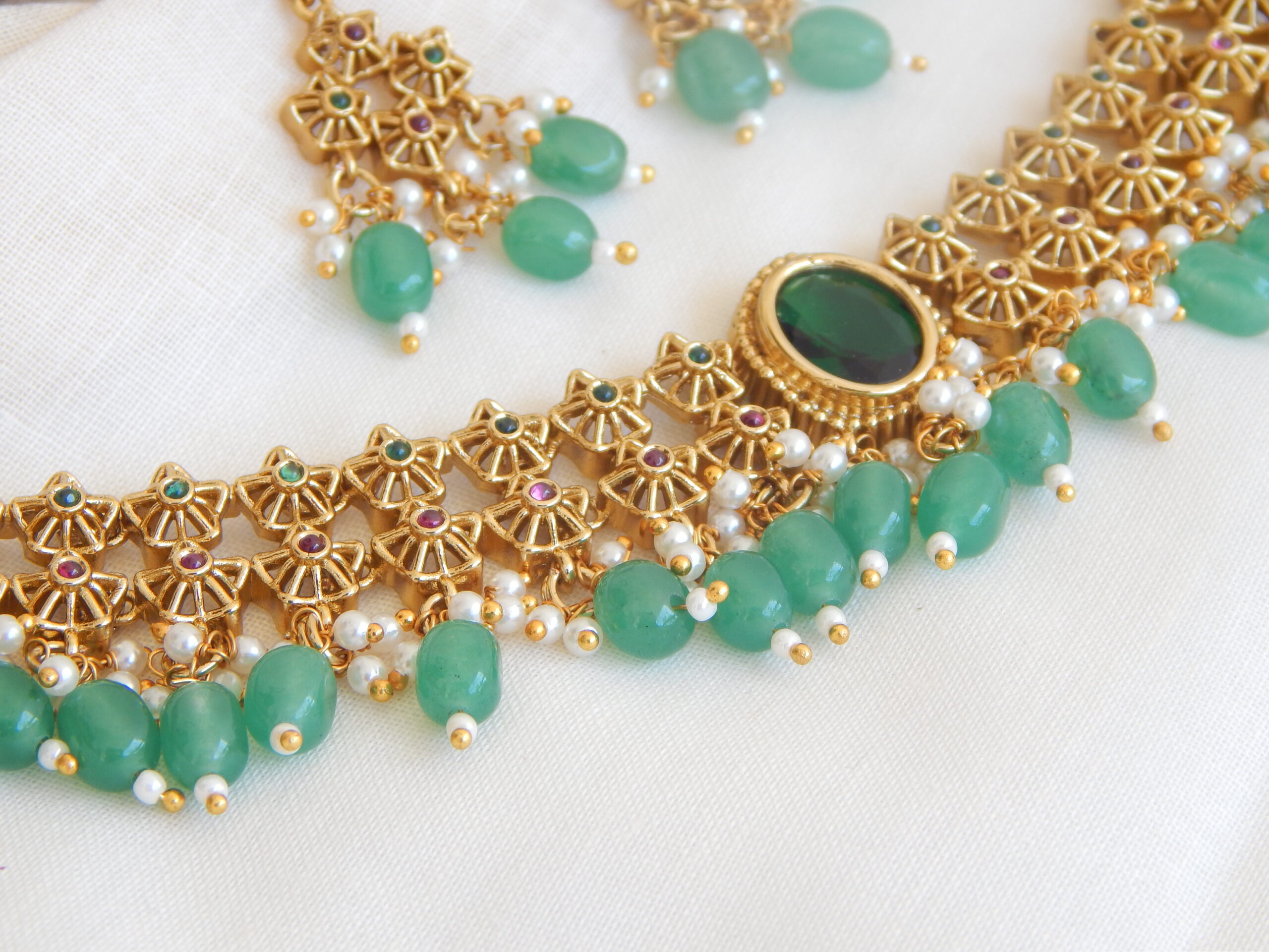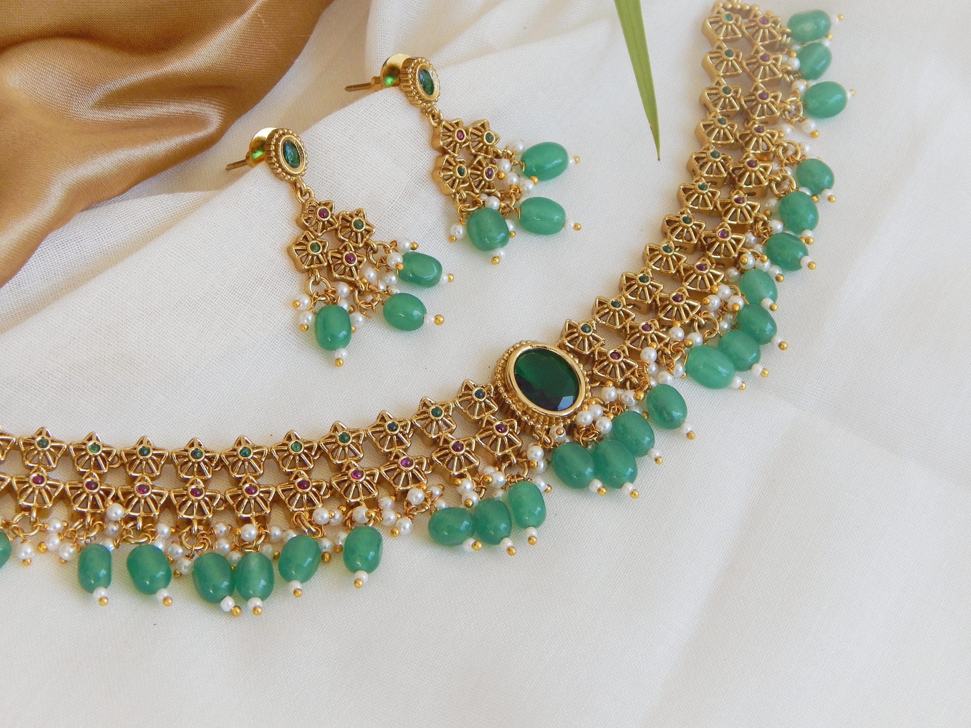 A stunning gold-finish choker set with green stones, pearls, and kundan floral motifs, paired with matching earrings—perfect for weddings and festive occasions.