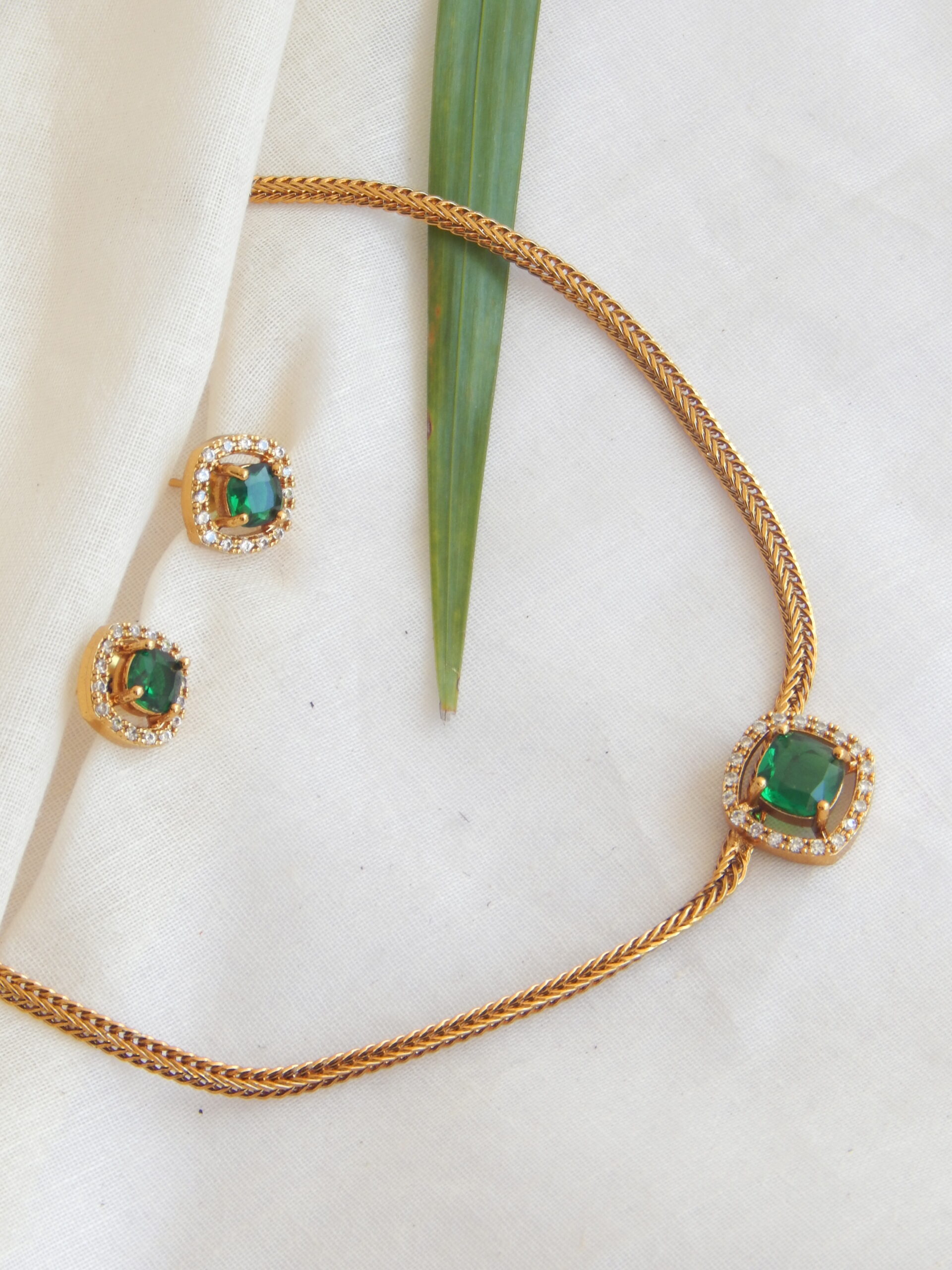 A sleek and lightweight choker featuring square green stones on a golden base, paired with simple studs. Ideal for office wear, casual ethnic looks, and layering with heavier jewelry.