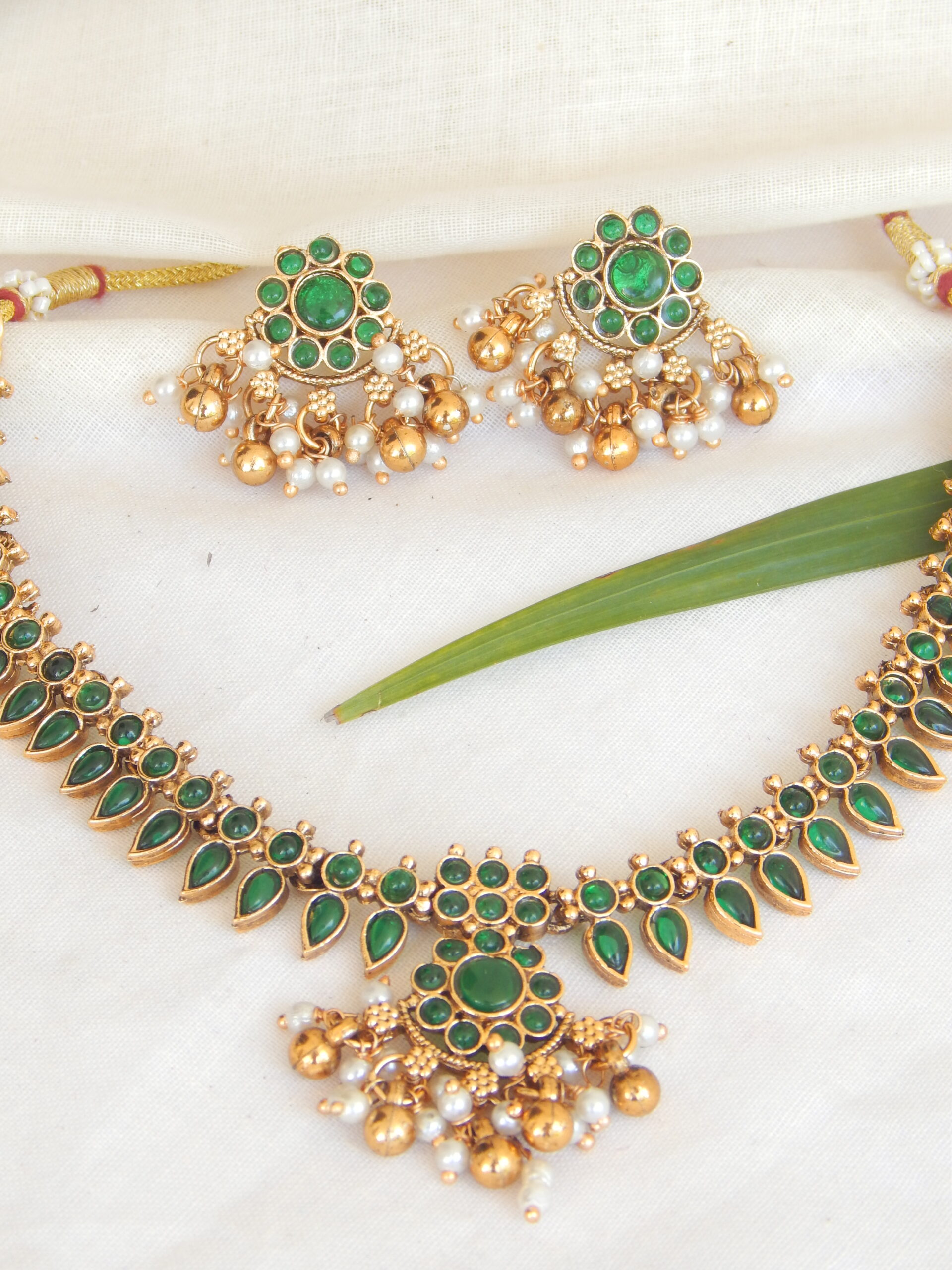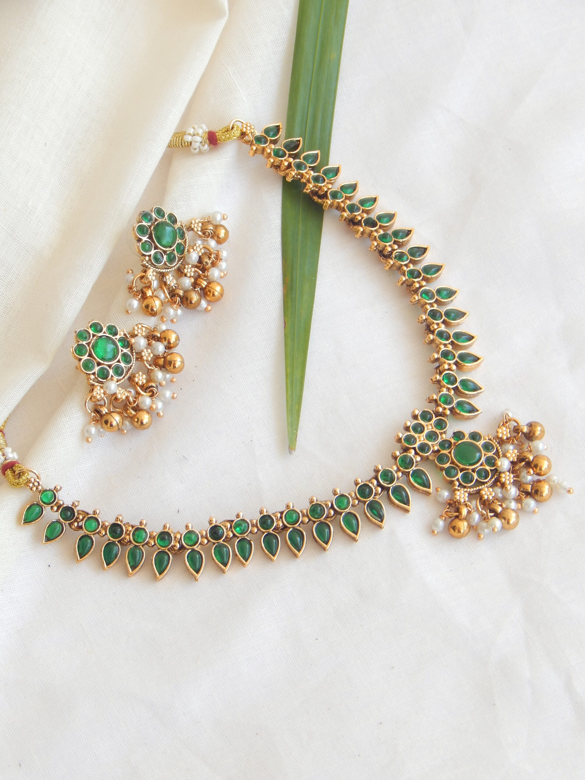 Featuring an exquisite leaf-patterned emerald necklace highlighted with golden pearls, this set comes with green floral jhumkas. A must-have statement piece for weddings, functions, and ethnic celebrations