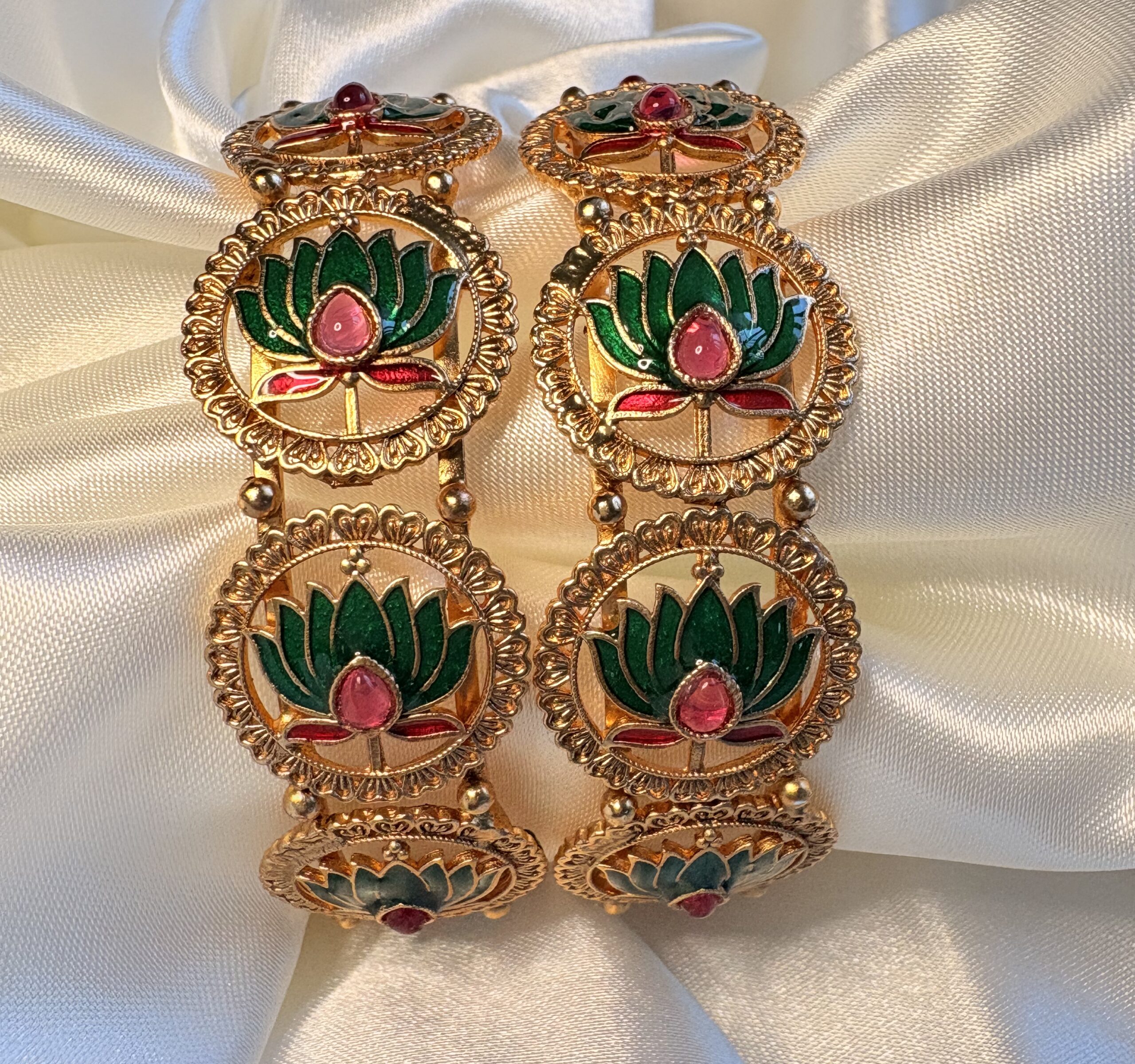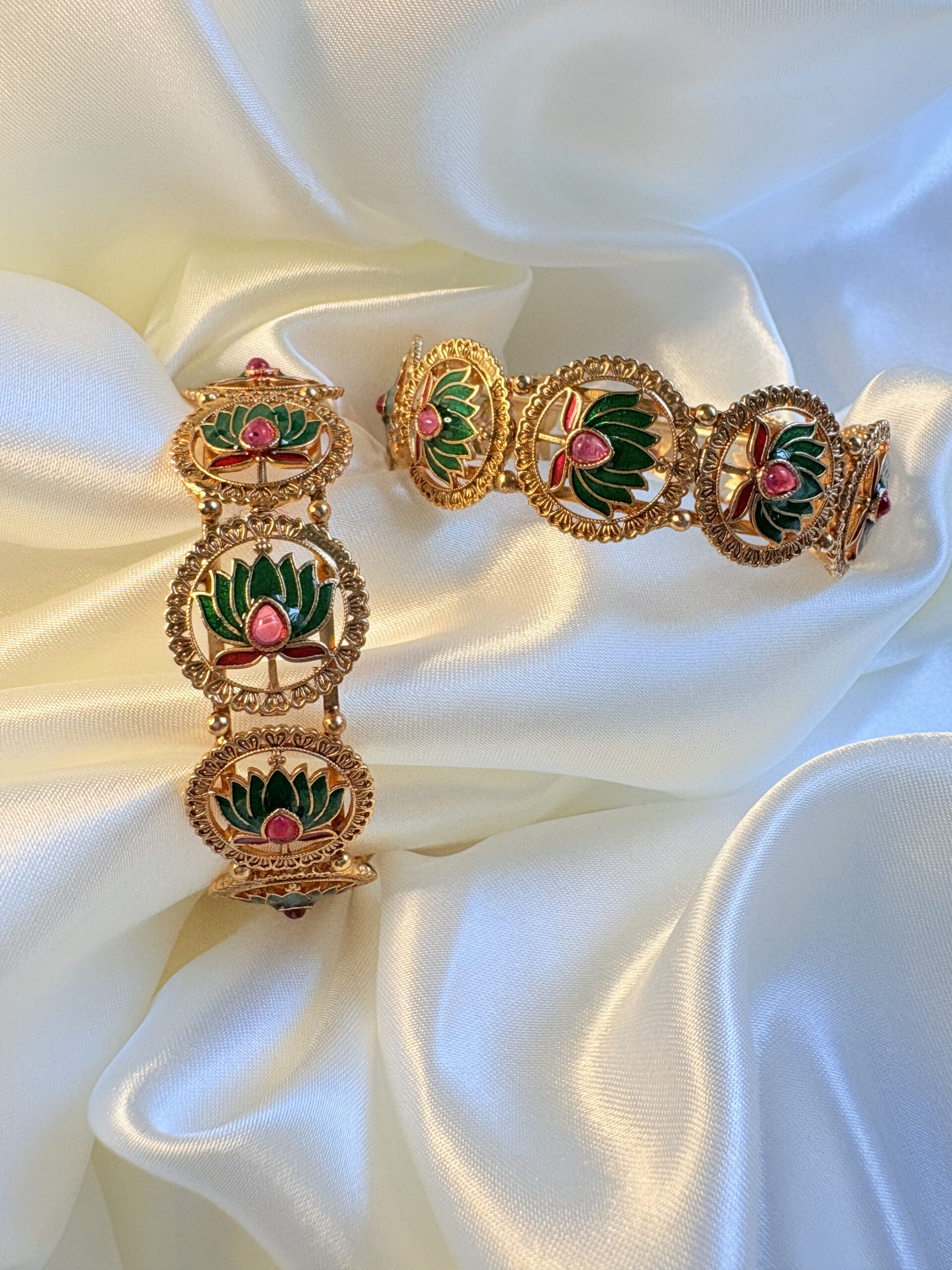 Traditional floral bangle with green and pink lotus enamel work – elegant and symbolic handcrafted jewelry.