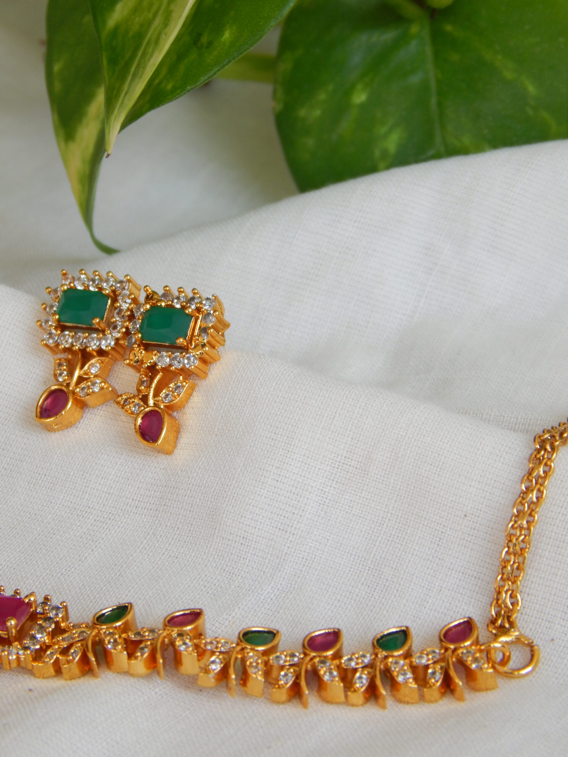 Buy emerald ruby gold plated simple chain necklace set for women with matching earrings. Lightweight festive jewellery at ₹599.