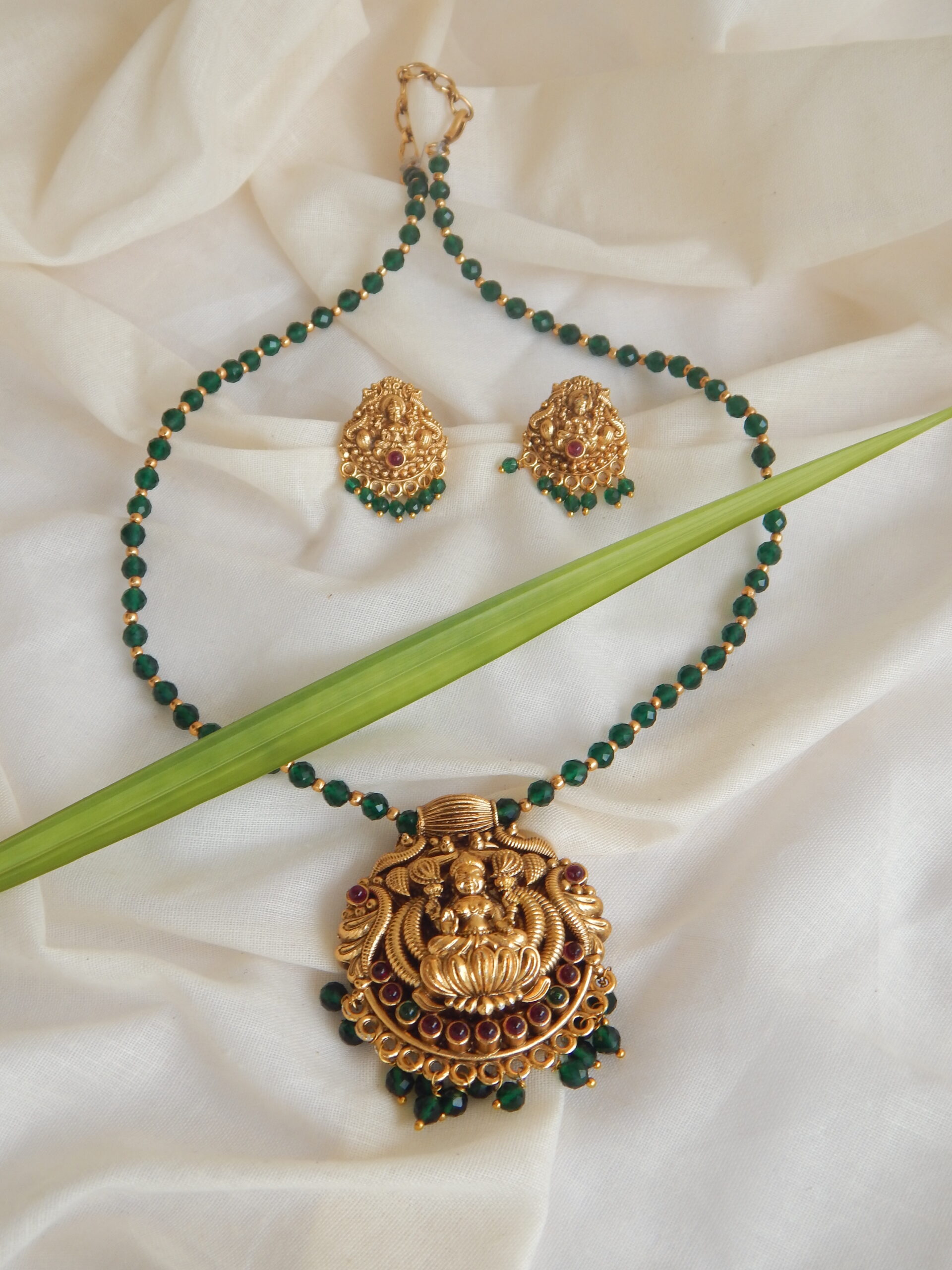 Green beaded temple jewellery necklace with Lakshmi pendant and earrings