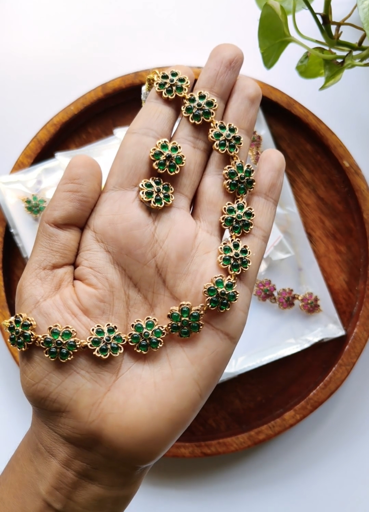 This floral Emerald stone necklace set is designed with dainty flower motifs embellished with emerald-colored stones. Lightweight yet elegant, it is perfect for casual festive wear, traditional celebrations, and gifting. The floral design adds a feminine charm that makes it suitable for all age groups. Comes with matching studs