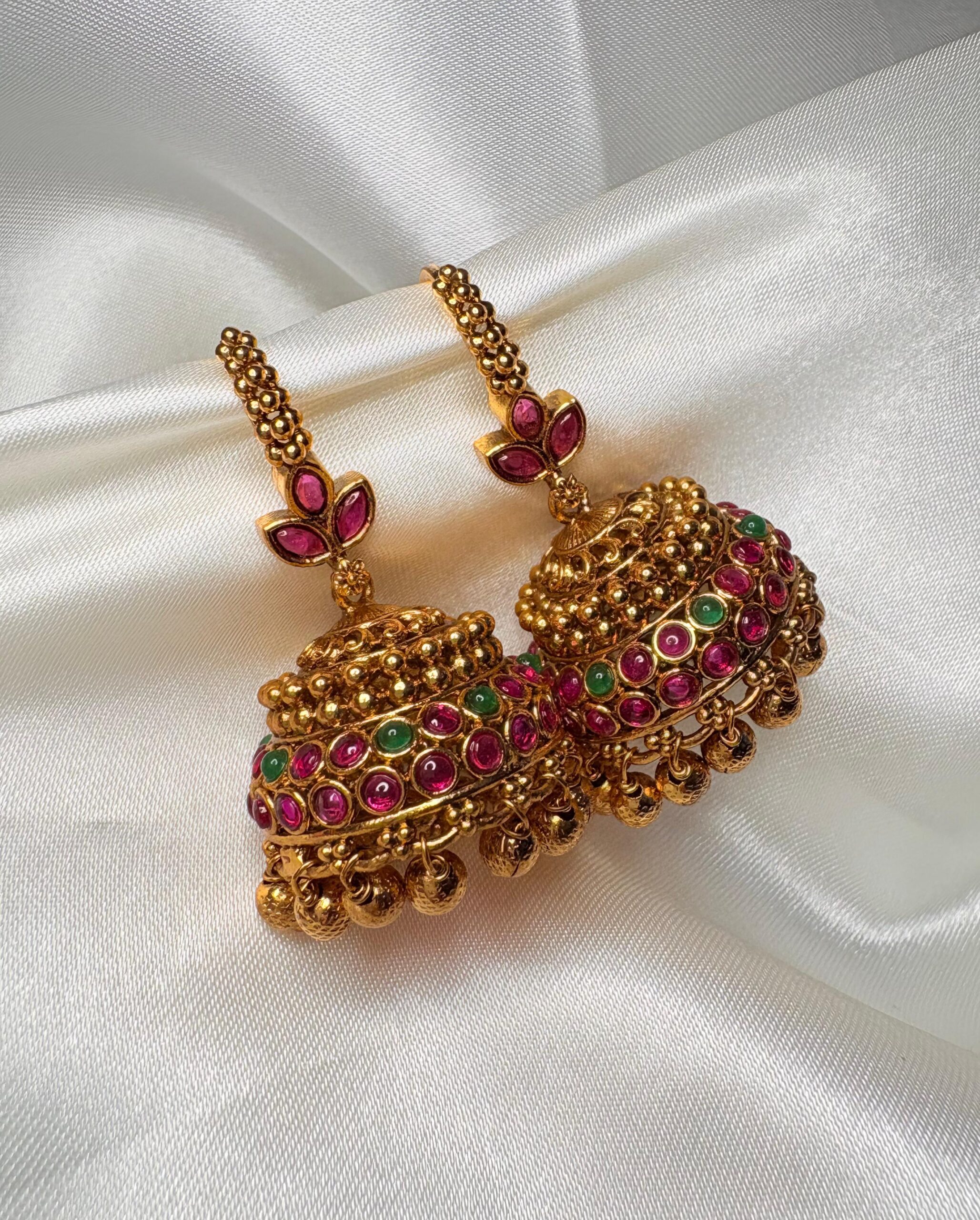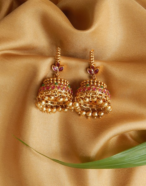 Colorful heritage jhumkas adorned with ruby and emerald stones