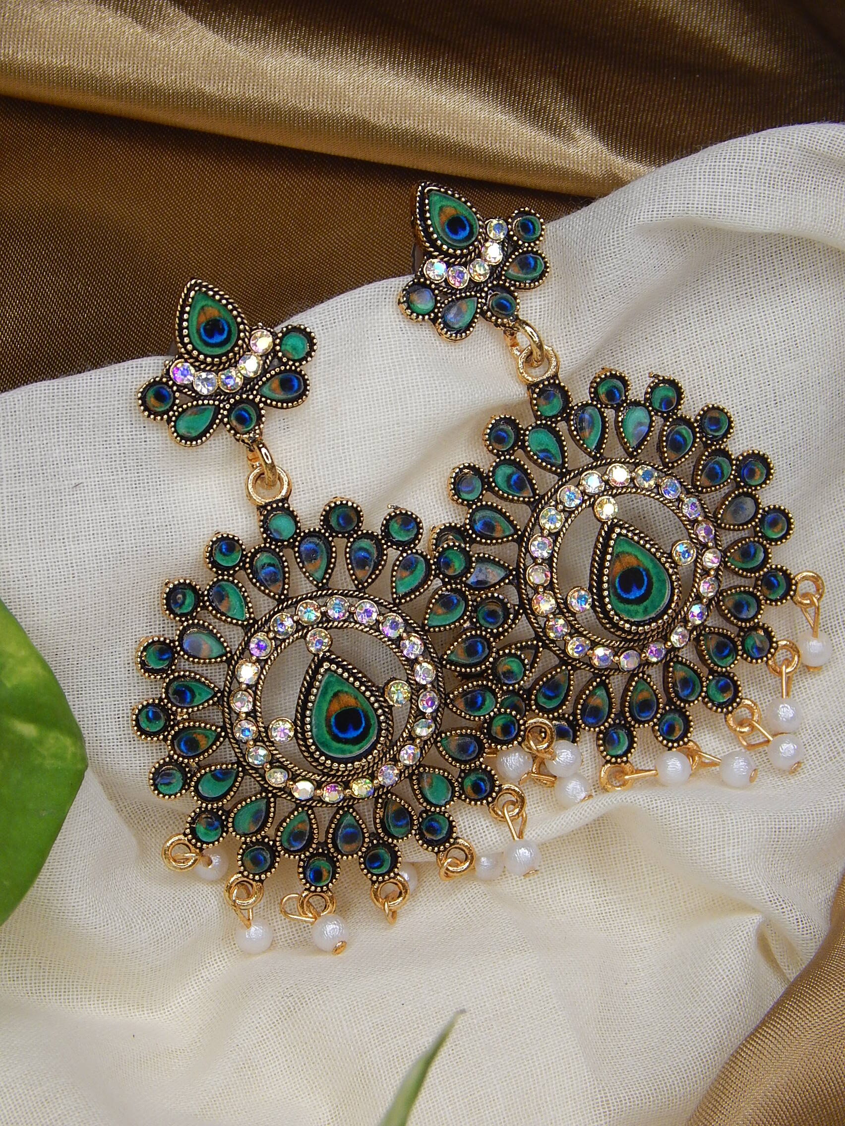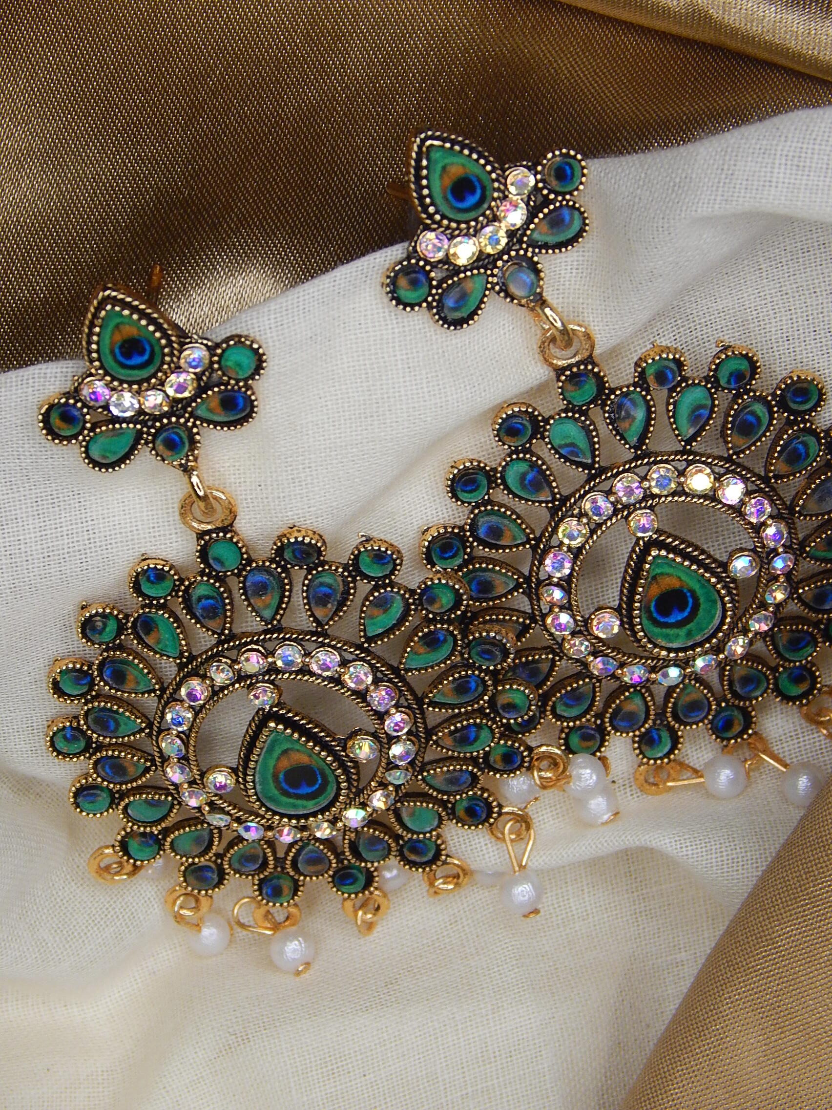 Peacock-inspired chandbali earrings with pearls.