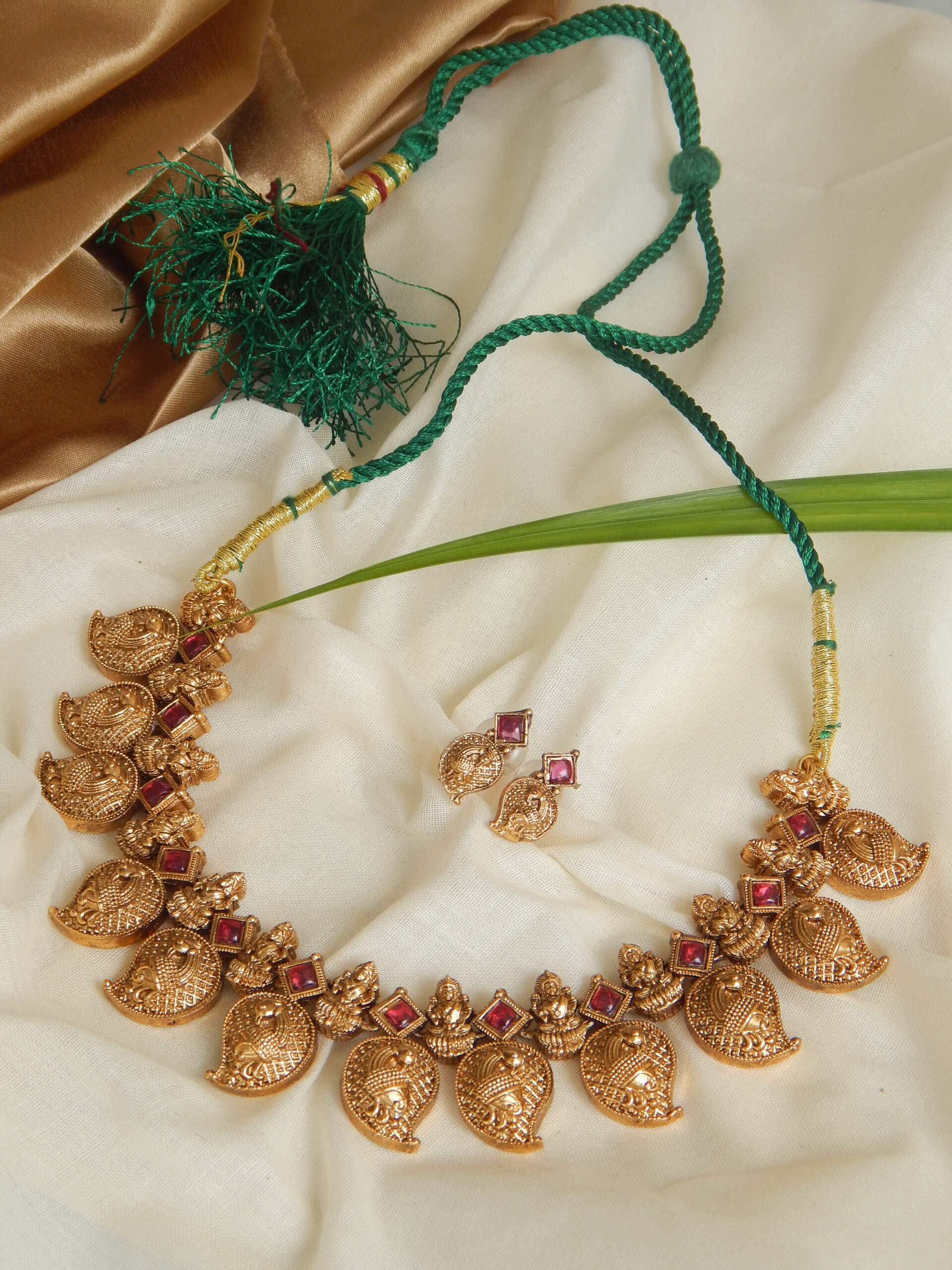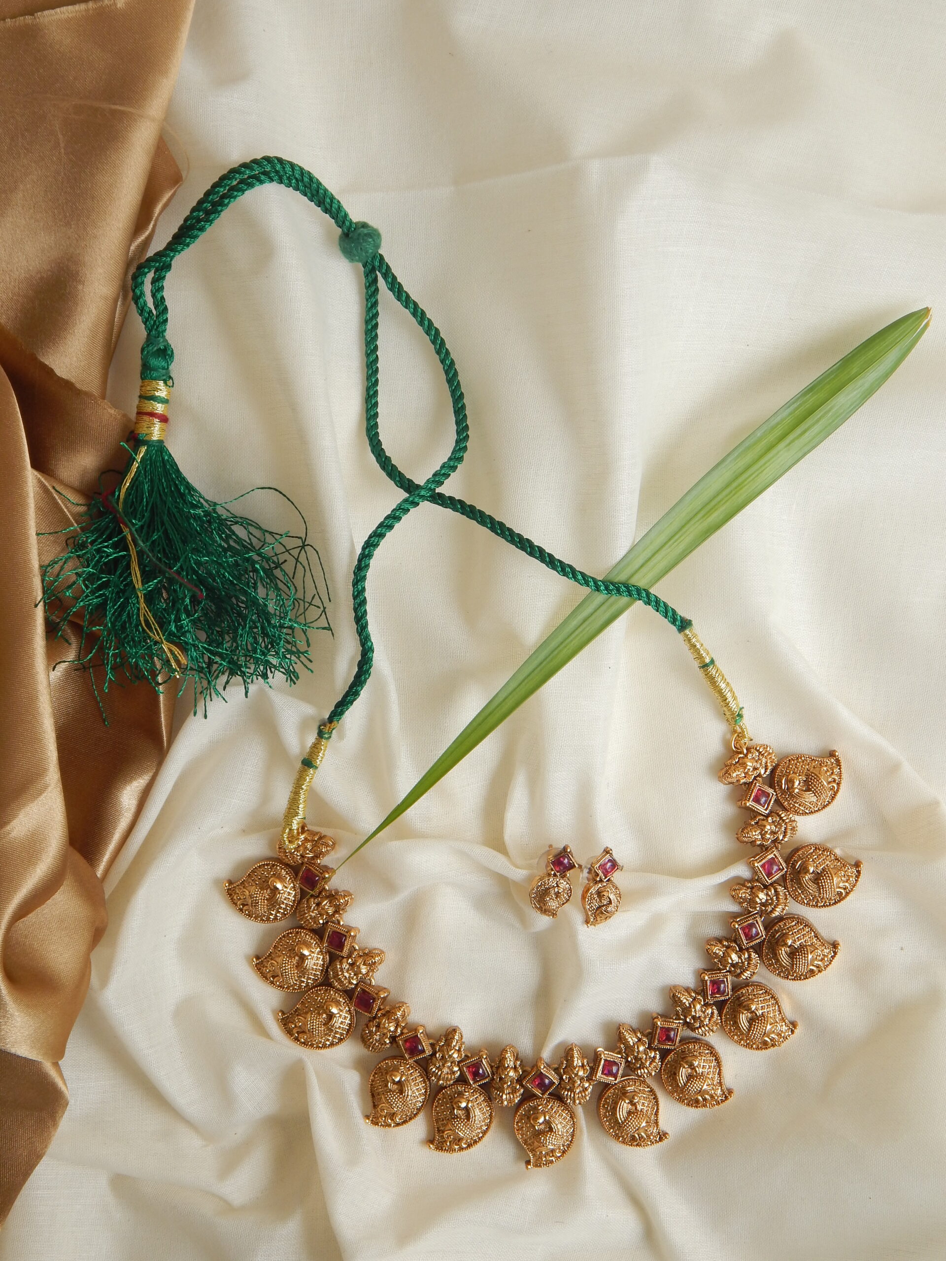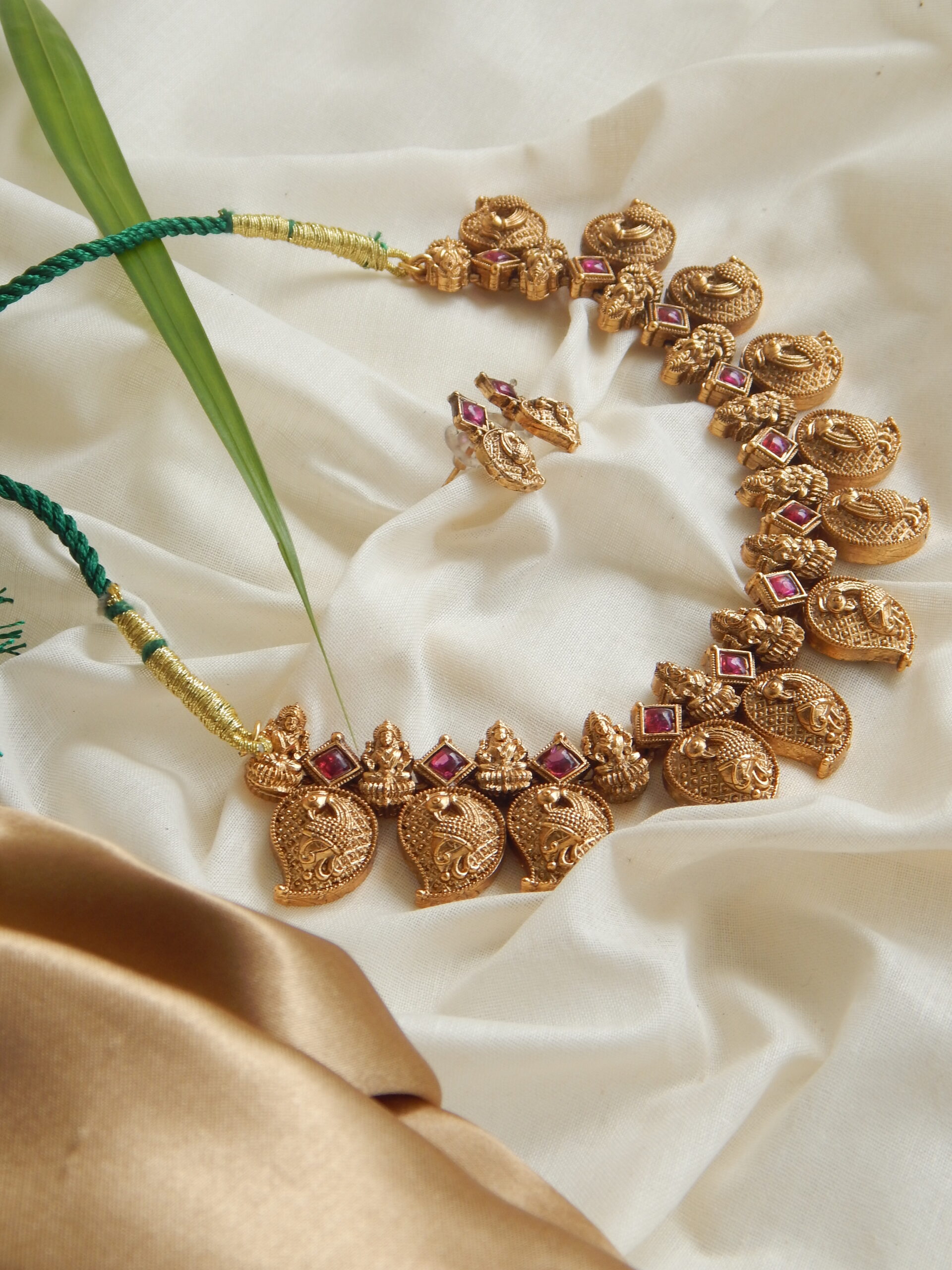 The Peacock Lakshmi Haaram is a masterpiece of temple jewellery, featuring goddess Lakshmi motifs and regal peacock designs enhanced with ruby stones. Crafted for bridal wear and festive occasions, it radiates grandeur and divine blessings.
