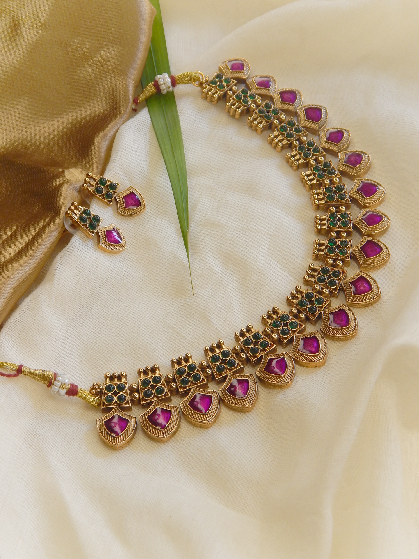 Traditional kundan necklace with purple and emerald stones in floral motifs, with earrings.