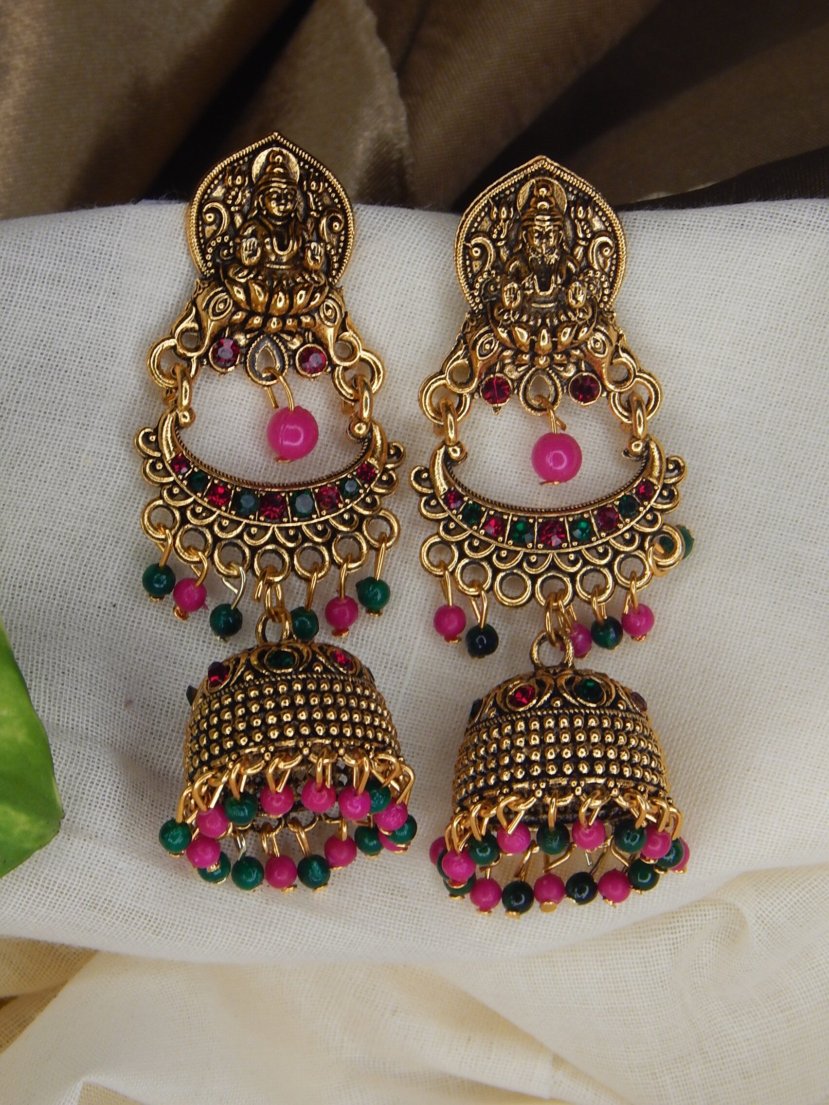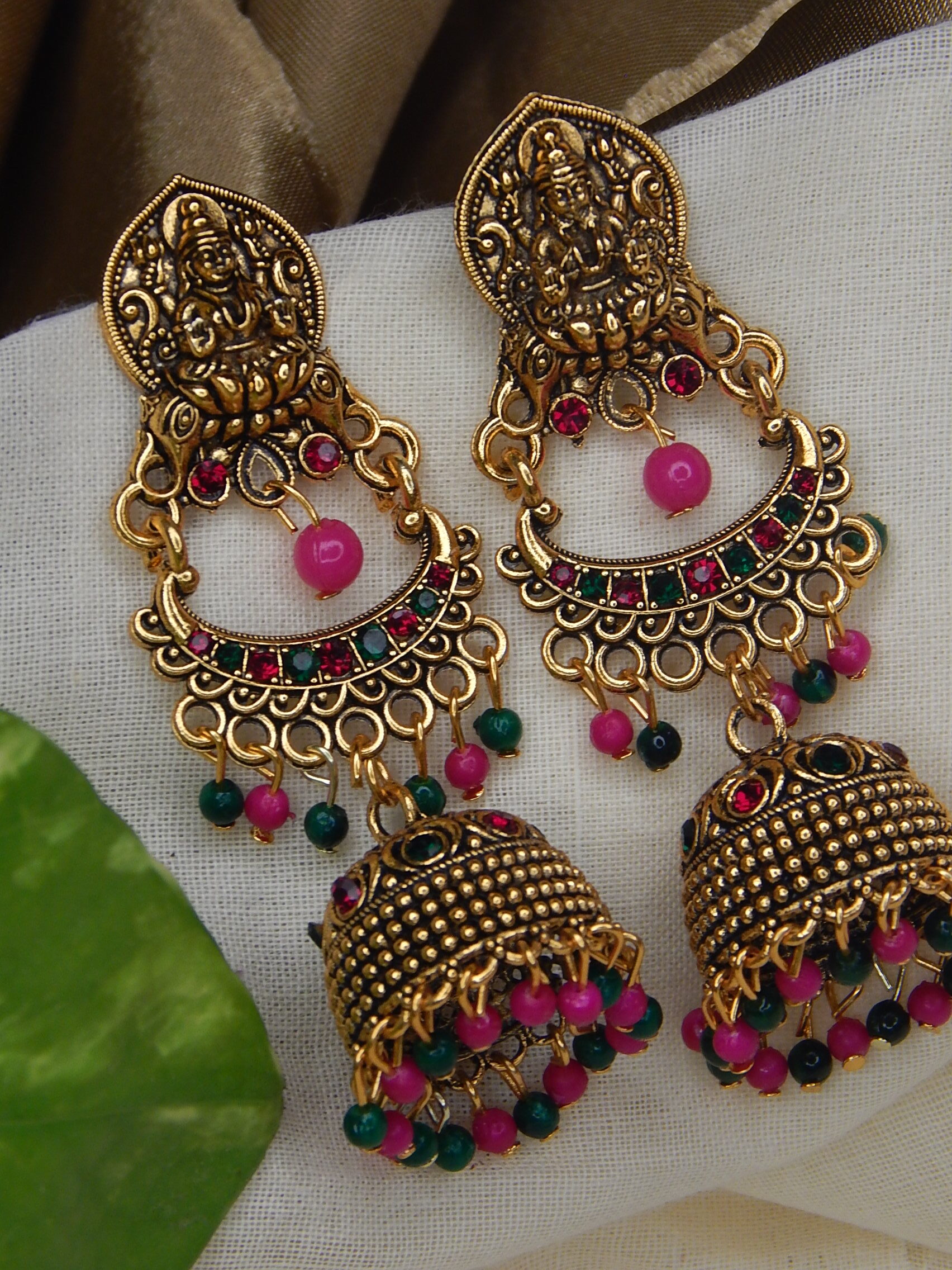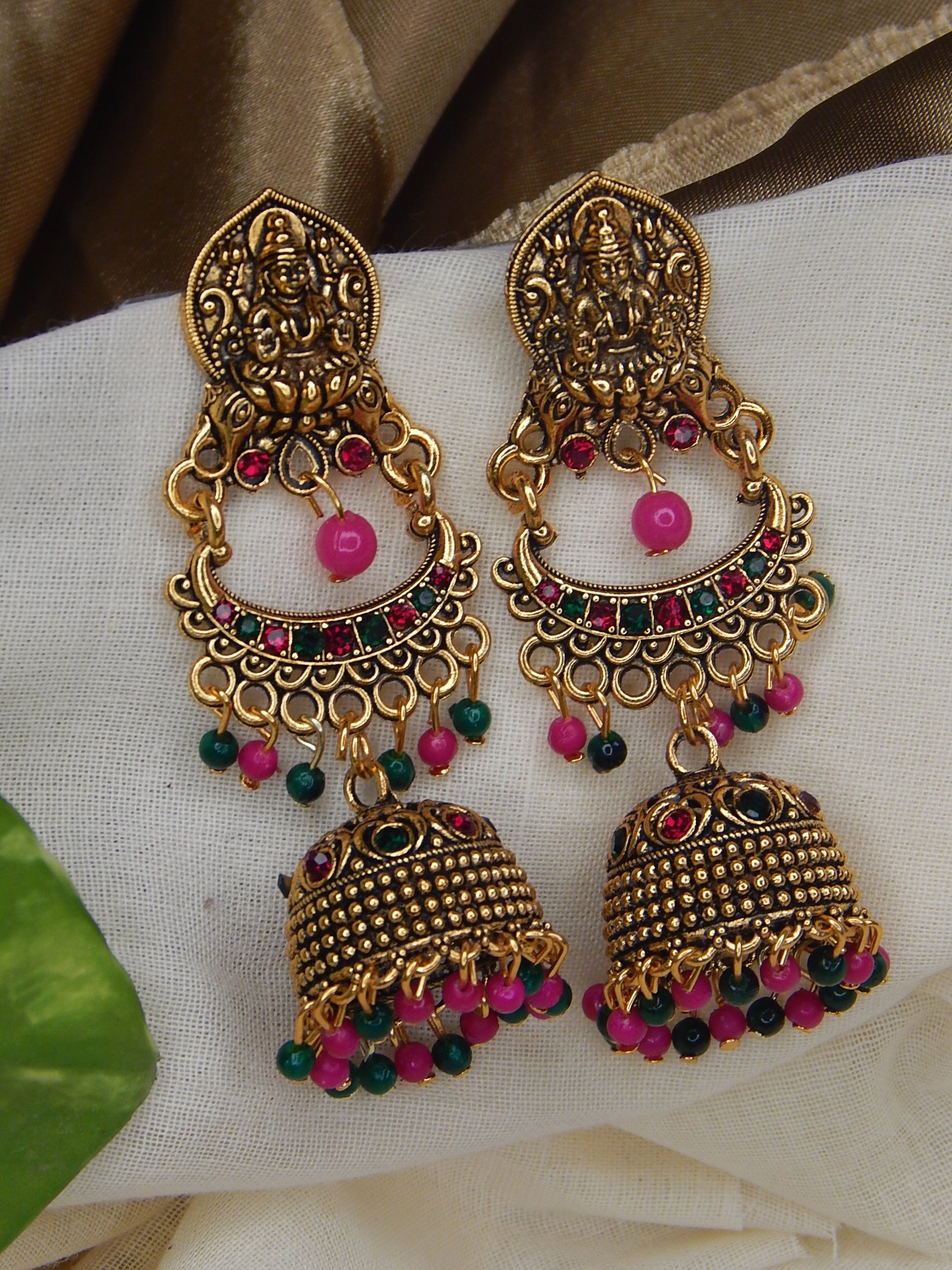 Traditional chandbali jhumkas with ruby and emerald bead accents.