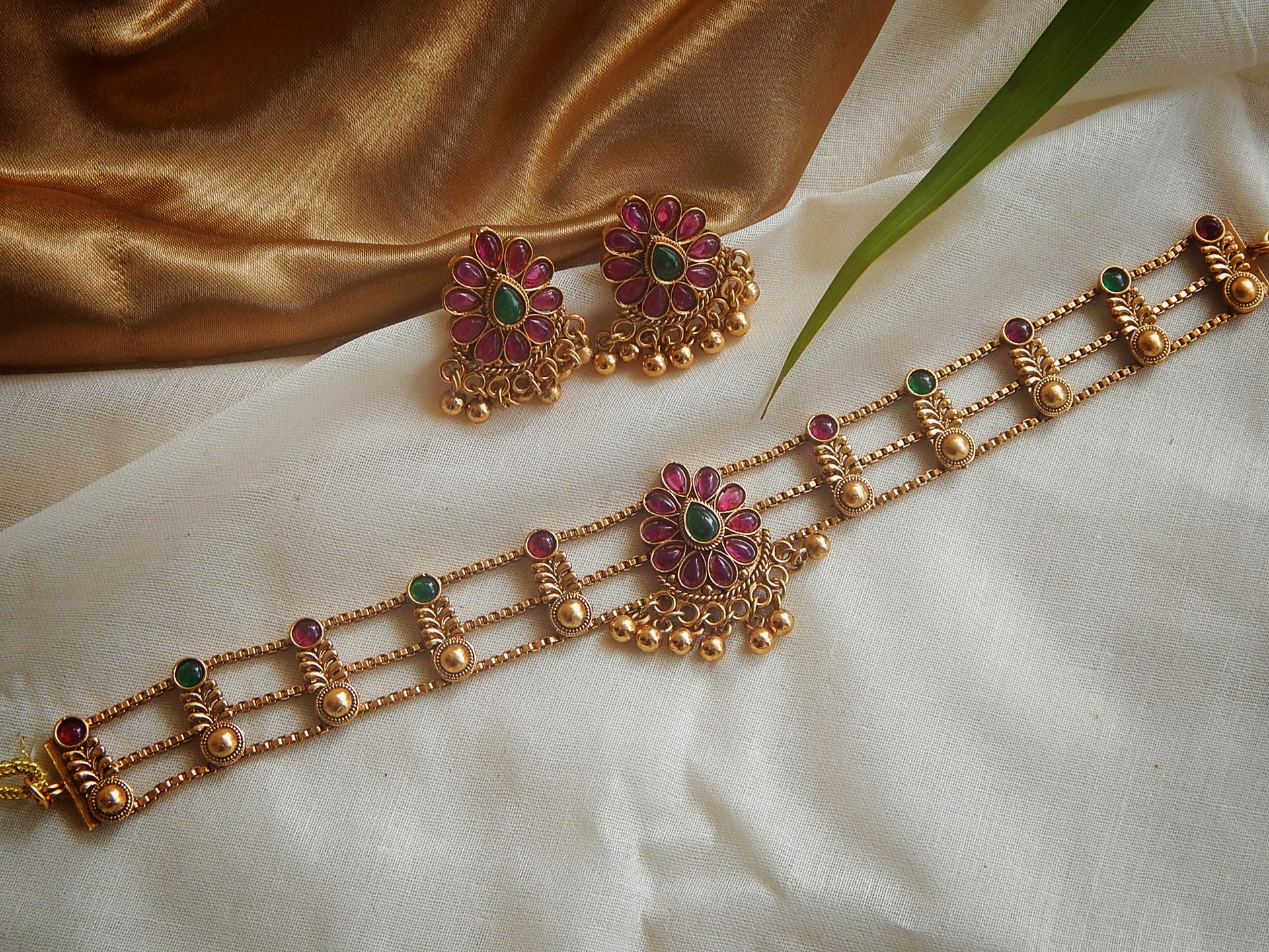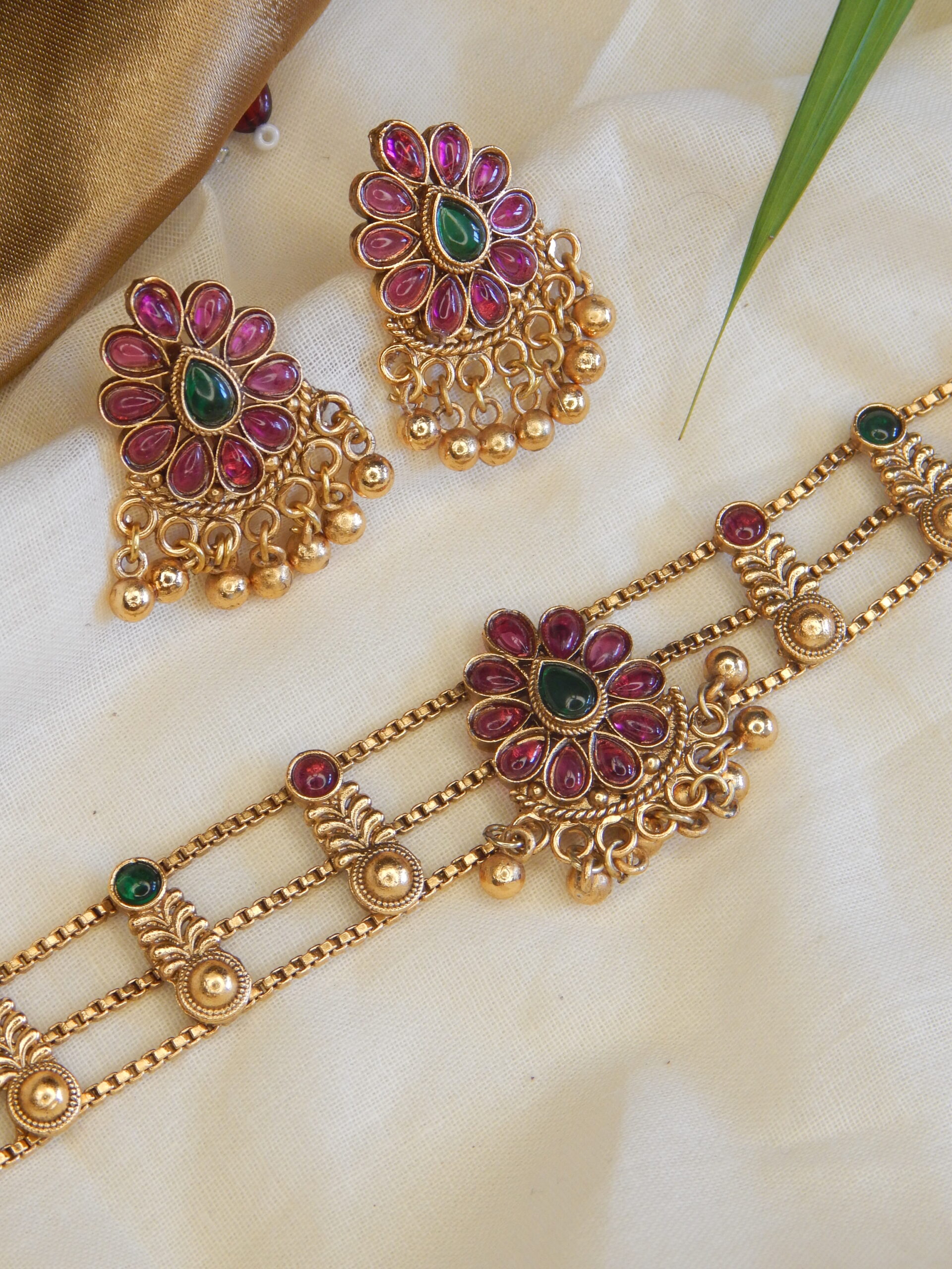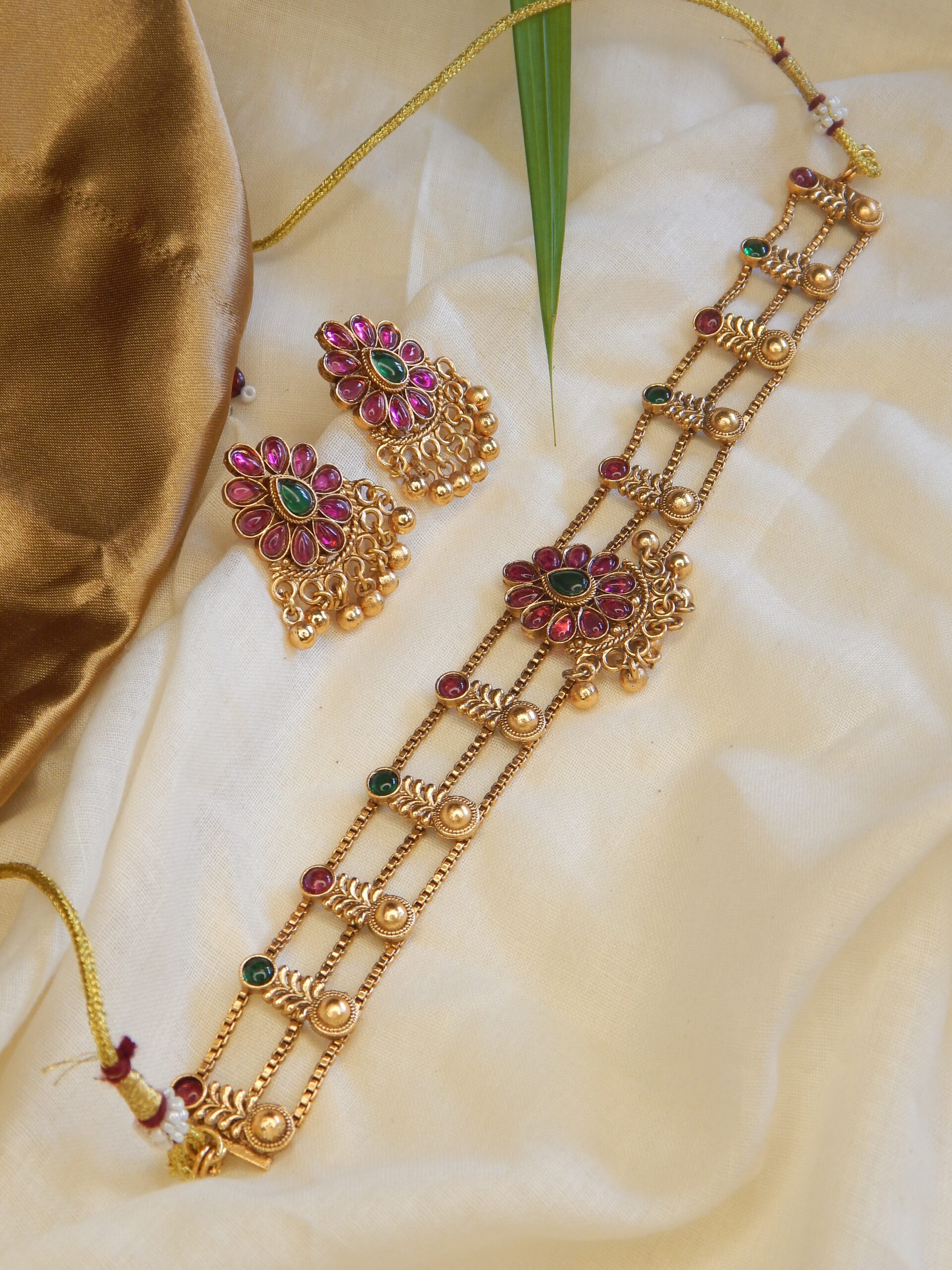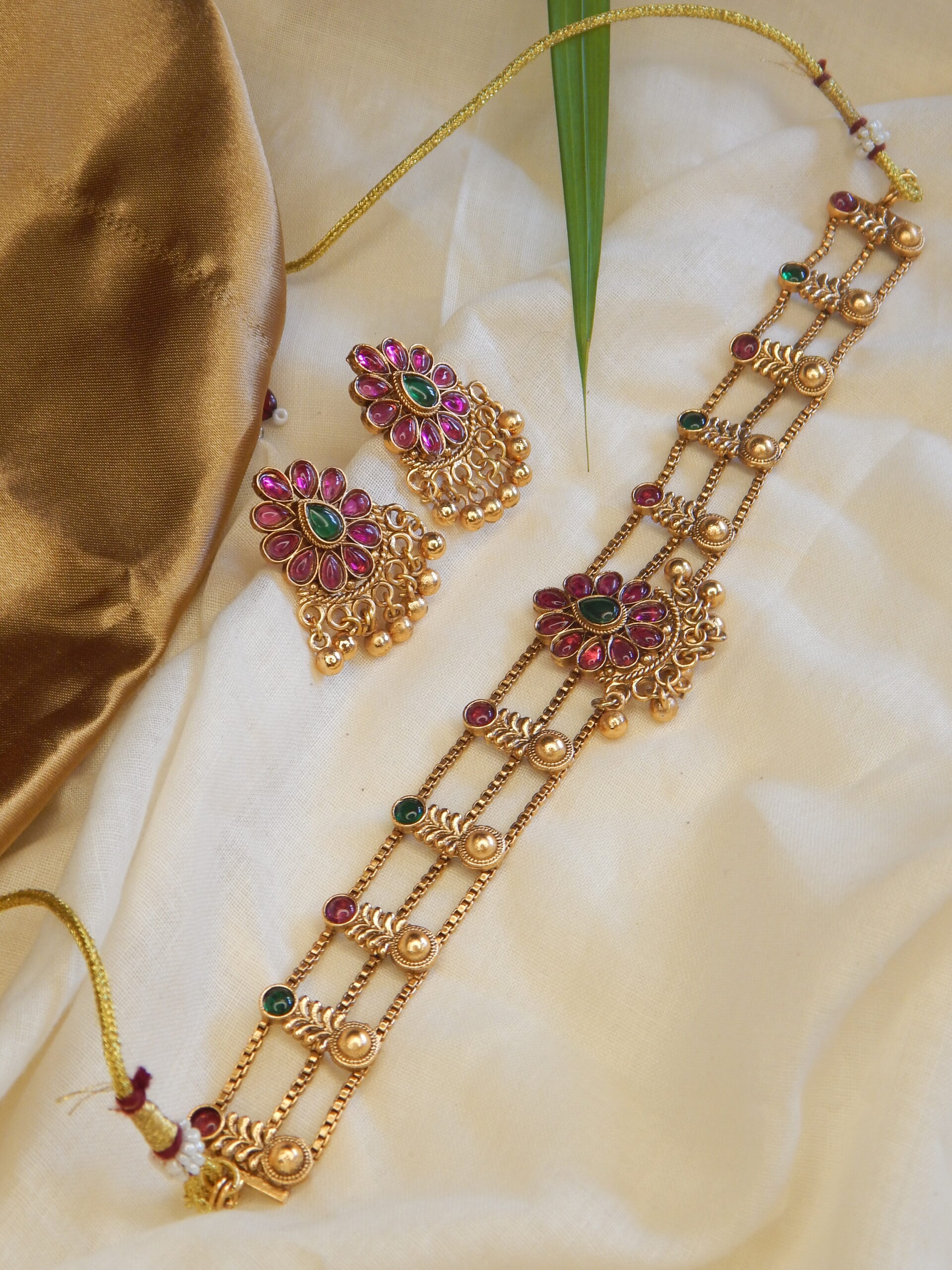Traditional lotus-inspired gold choker with ruby stones, golden bead drops, and matching earrings. Available in ruby, green, and mixed stone variations.
