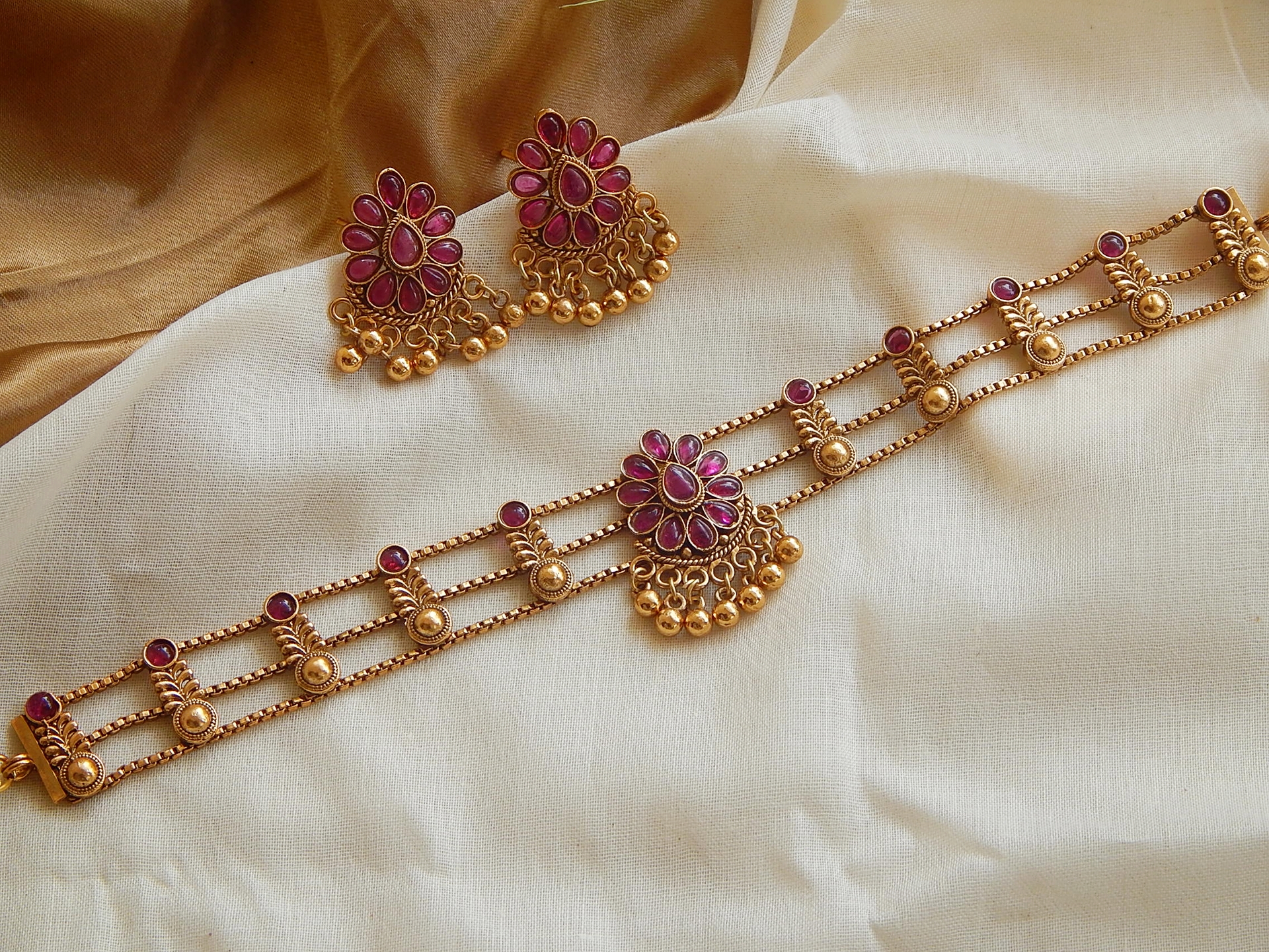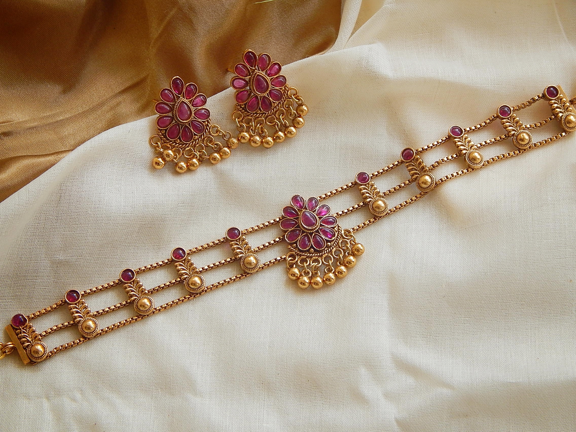 Traditional lotus-inspired gold choker with ruby stones, golden bead drops, and matching earrings. Available in ruby, green, and mixed stone variations.