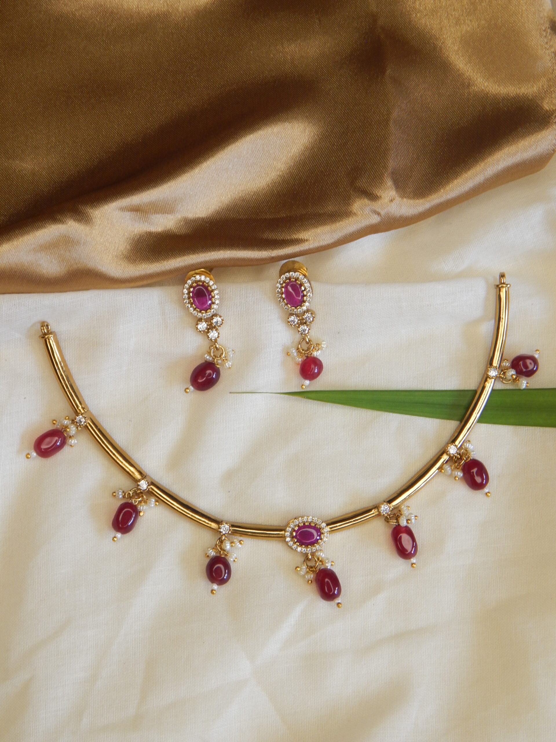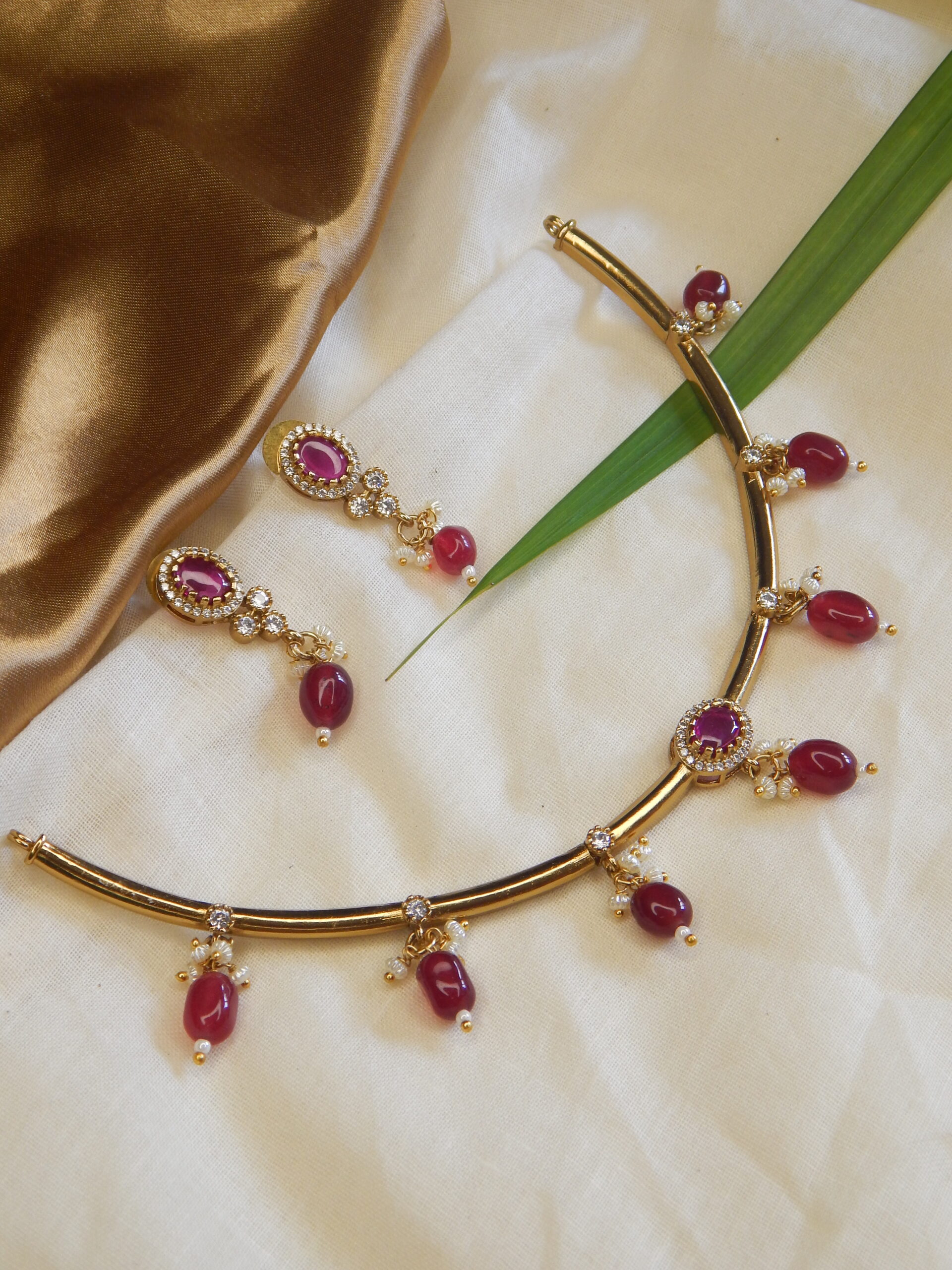 Bold gold choker with ruby drops and CZ accents, paired with matching earrings.