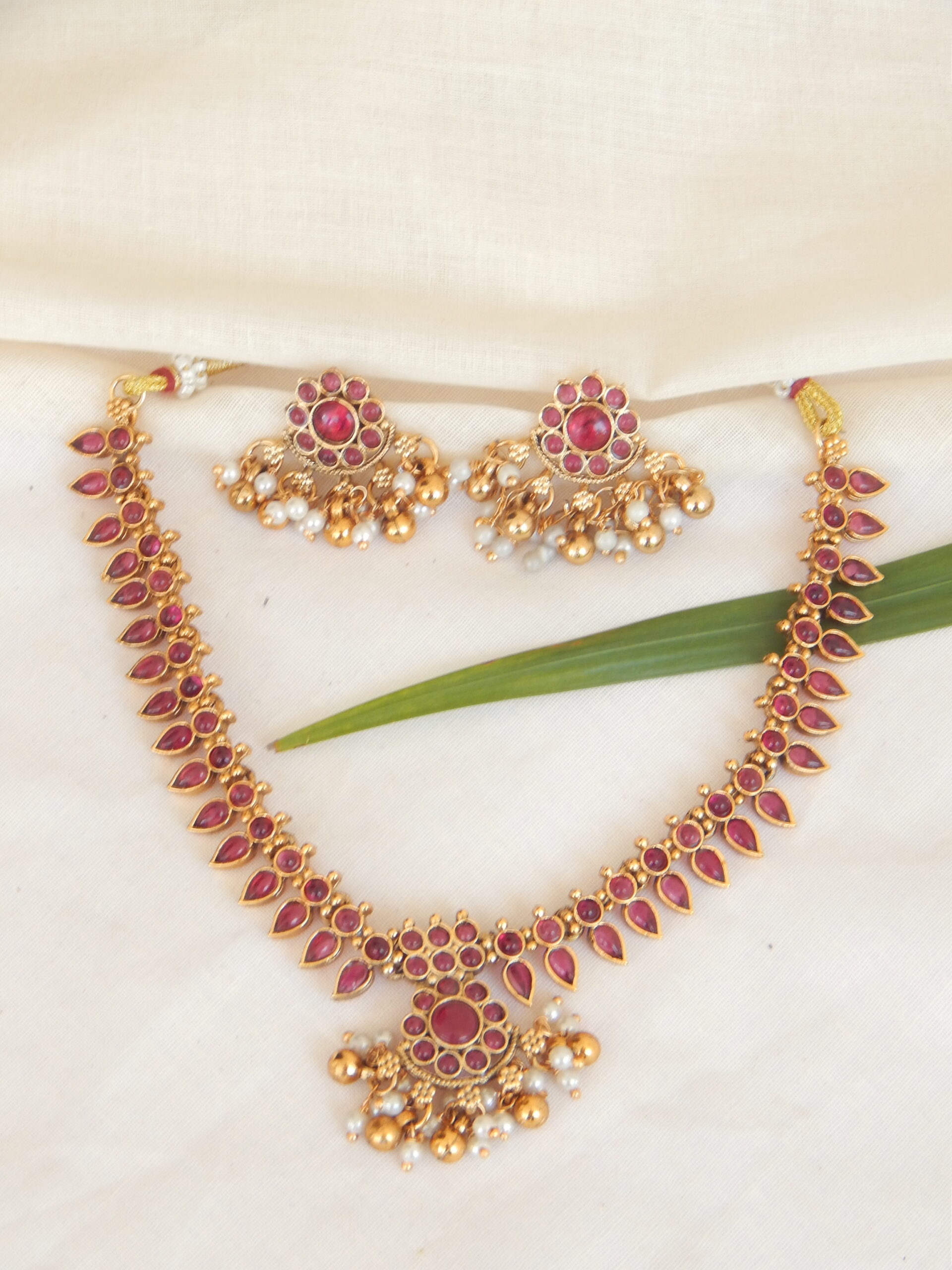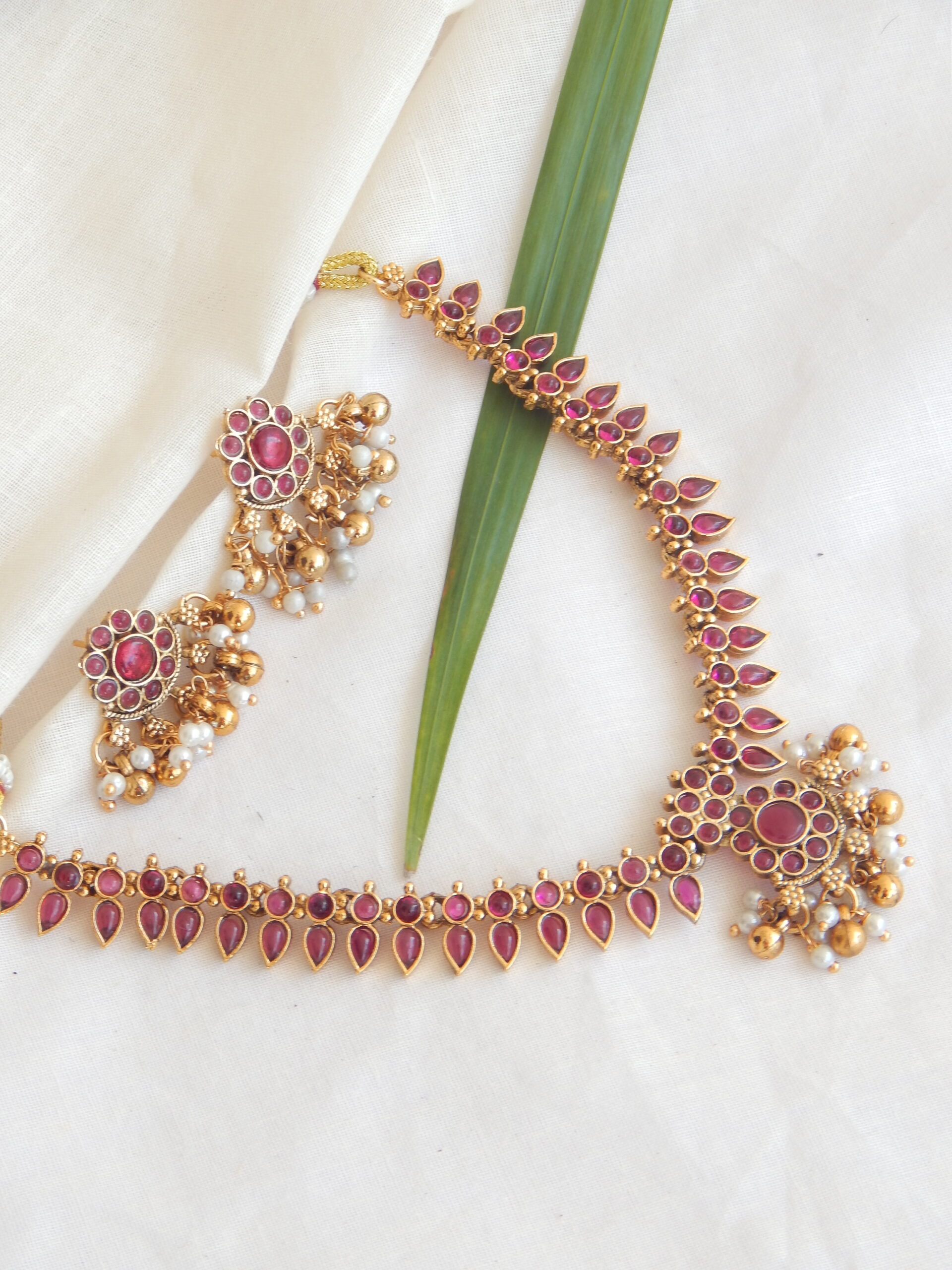 This ruby-studded leaf design necklace with delicate golden pearls comes with matching jhumkas. A classic South Indian-inspired piece that enhances sarees, silk outfits, and bridal looks with its vibrant red stones