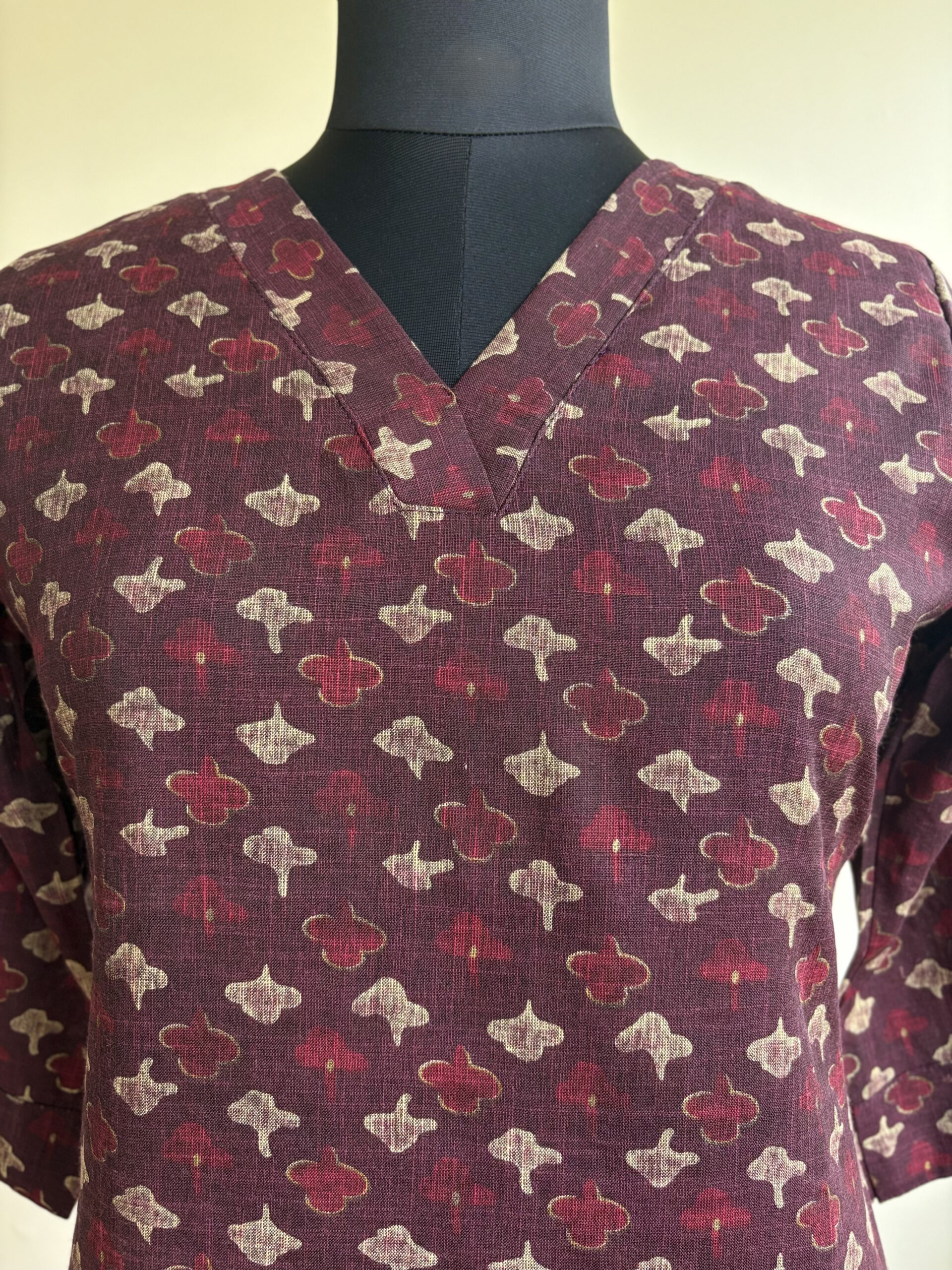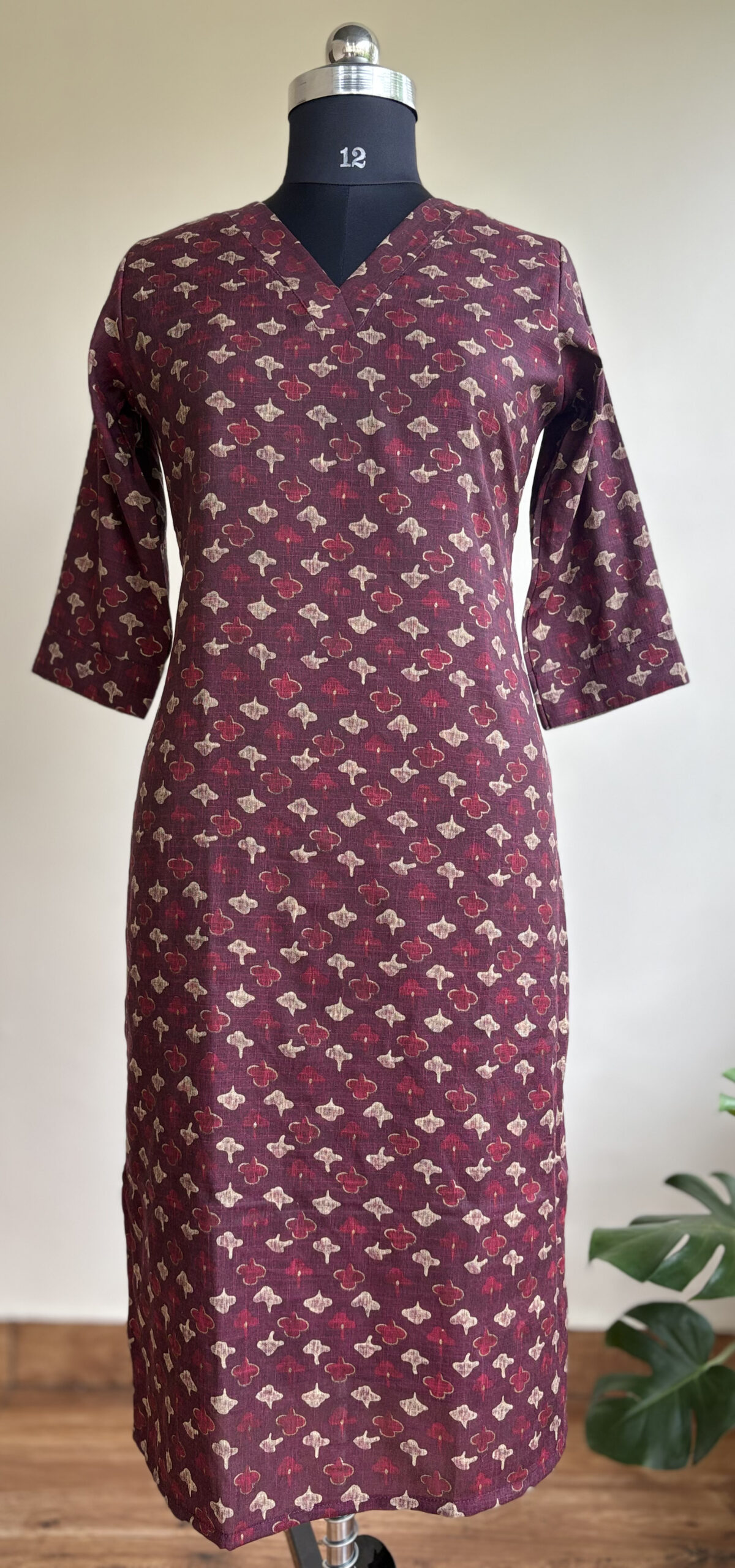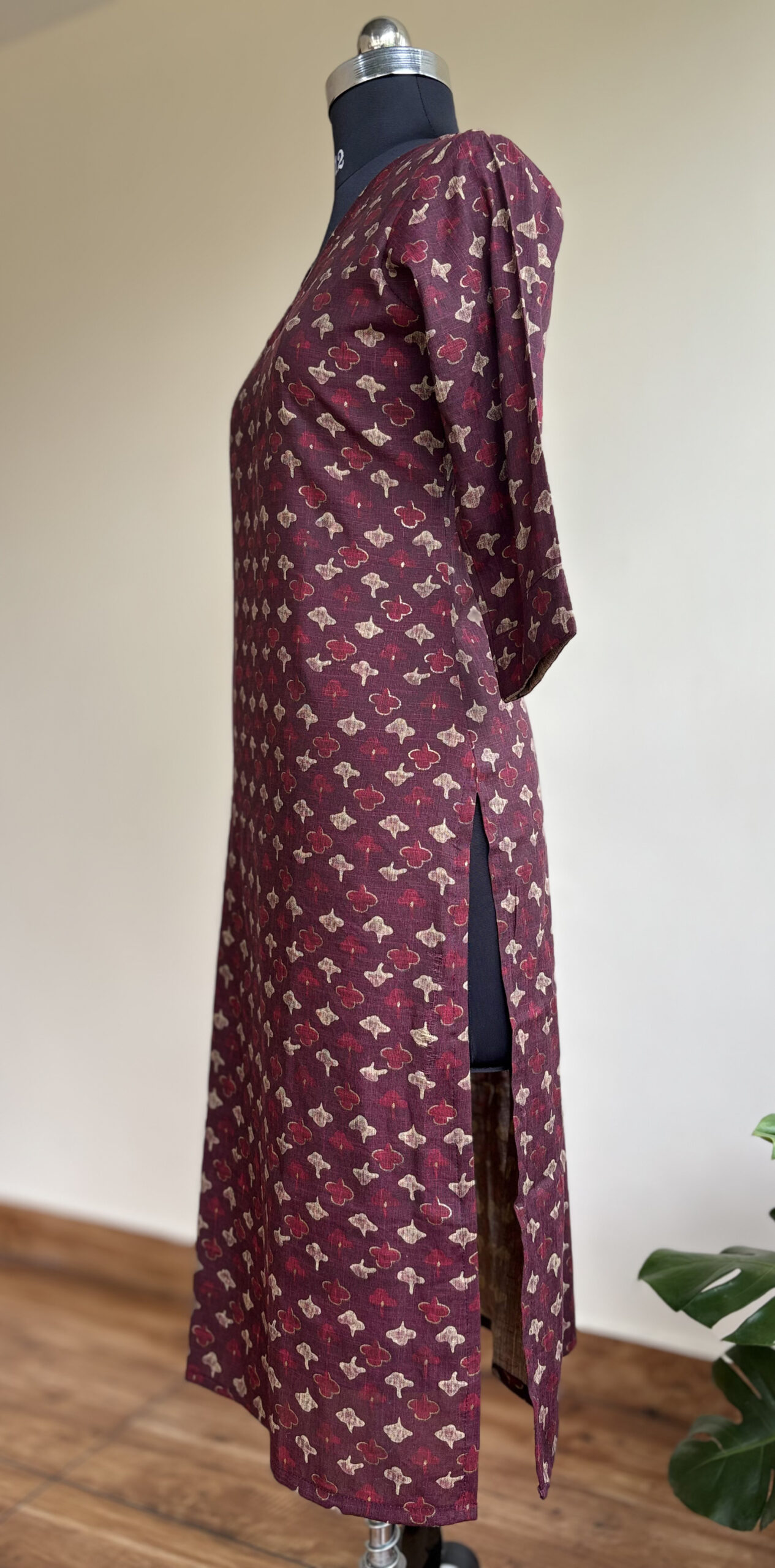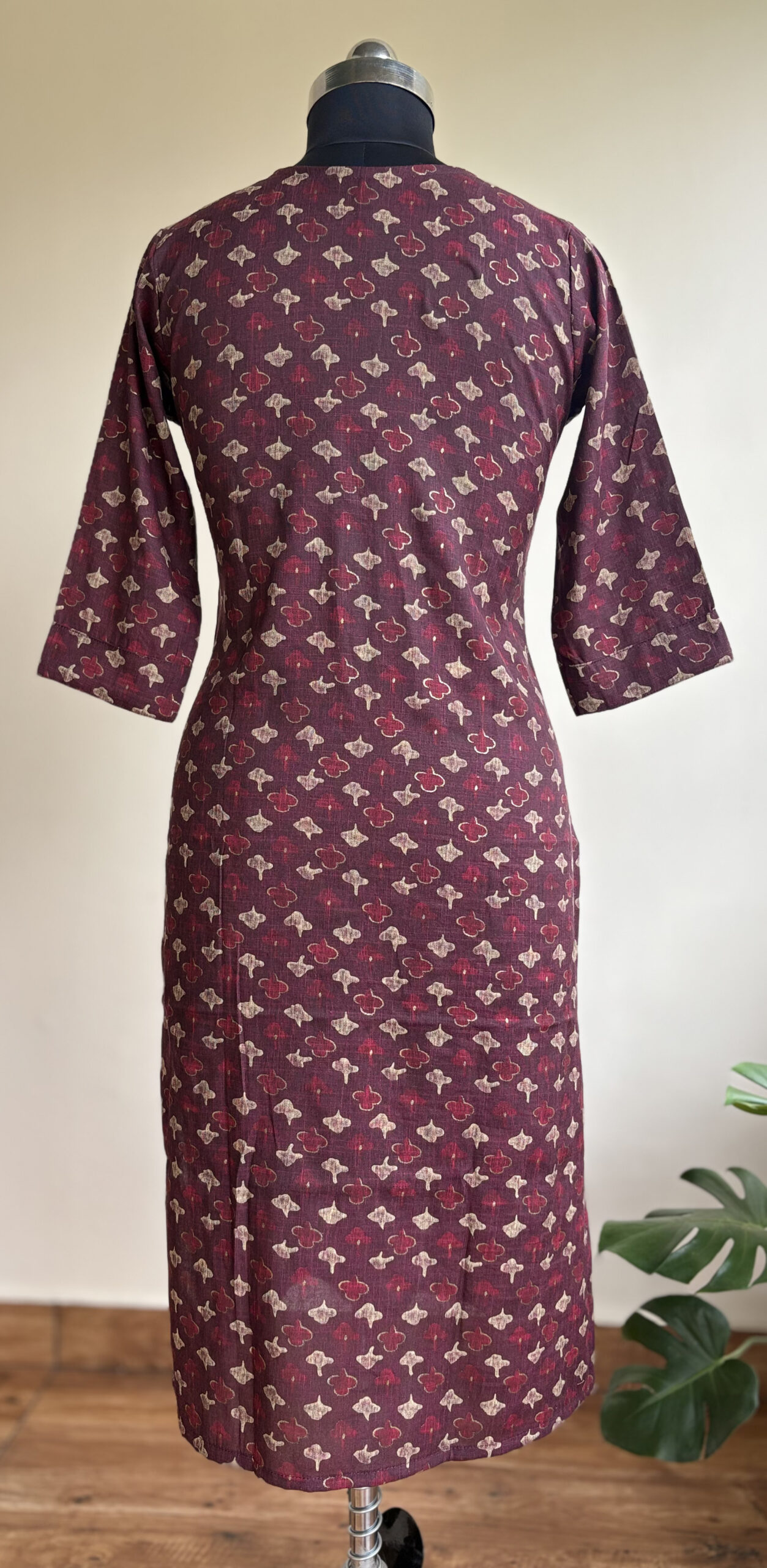 Wine-colored cotton mix kurti with subtle floral motifs. Elegant and versatile.