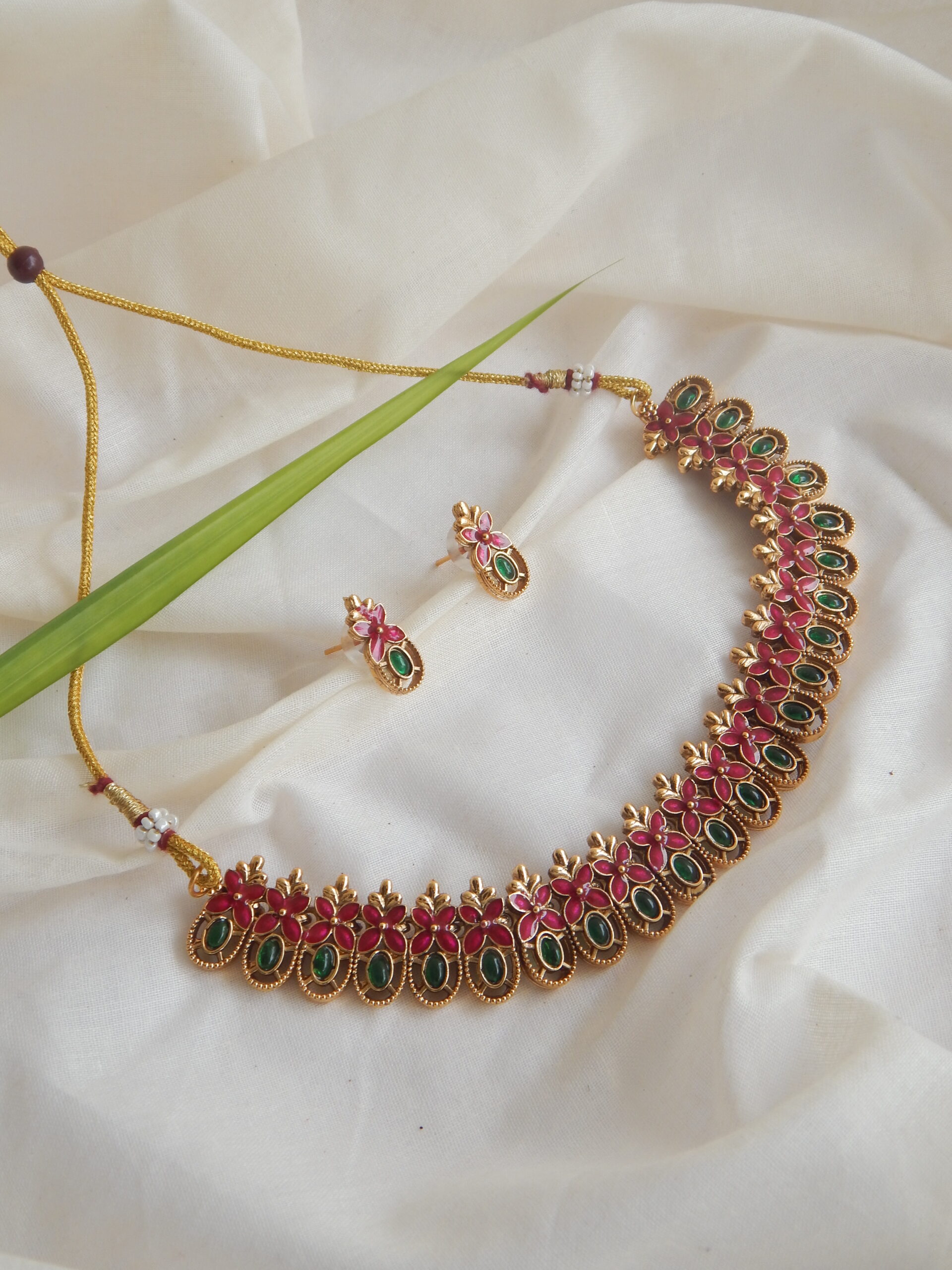 Traditional ruby-red and green enamel necklace set with earrings, perfect for weddings and festive wear.