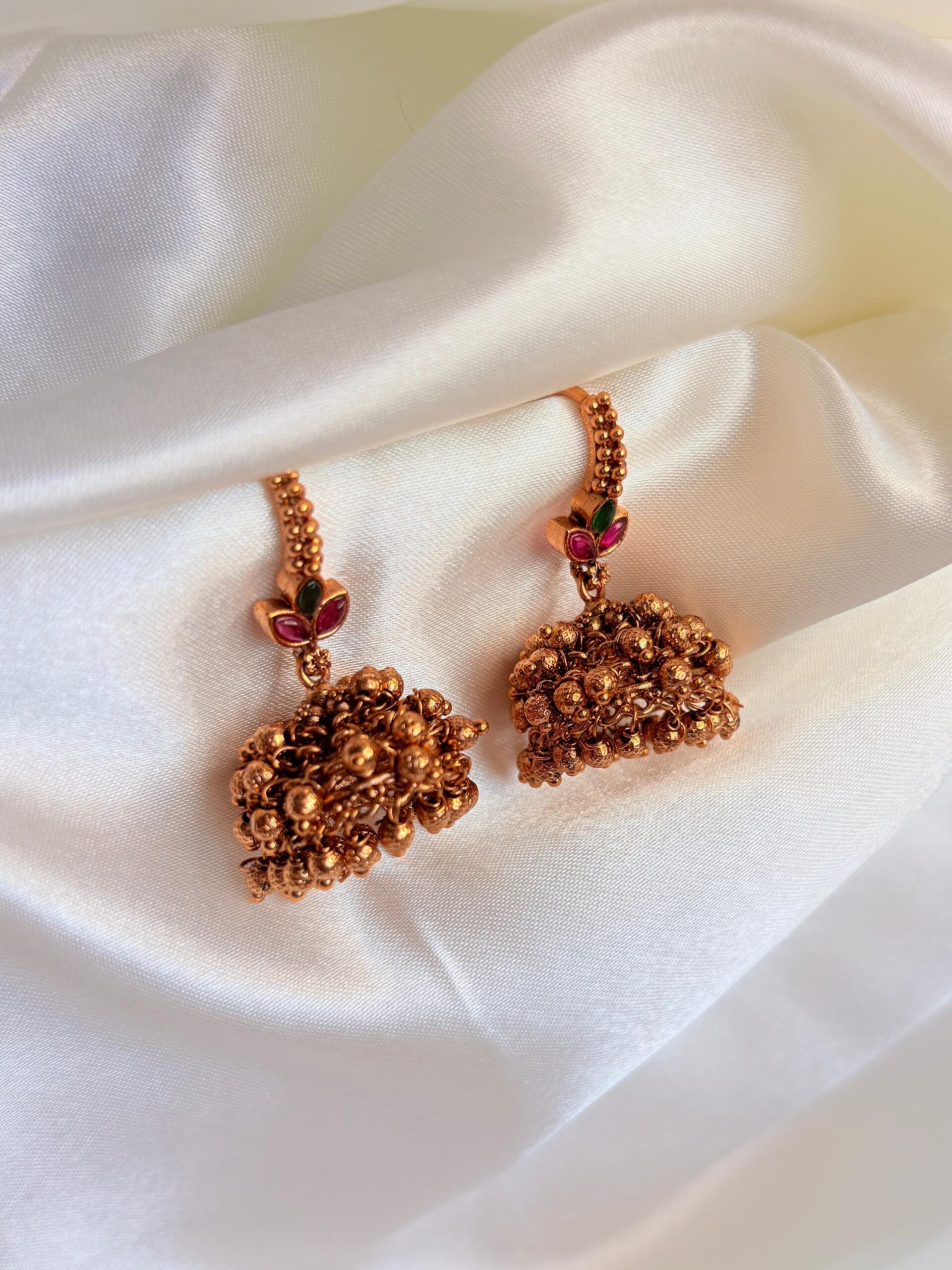 Traditional kasu jhumkas with antique charm and rich detailing.