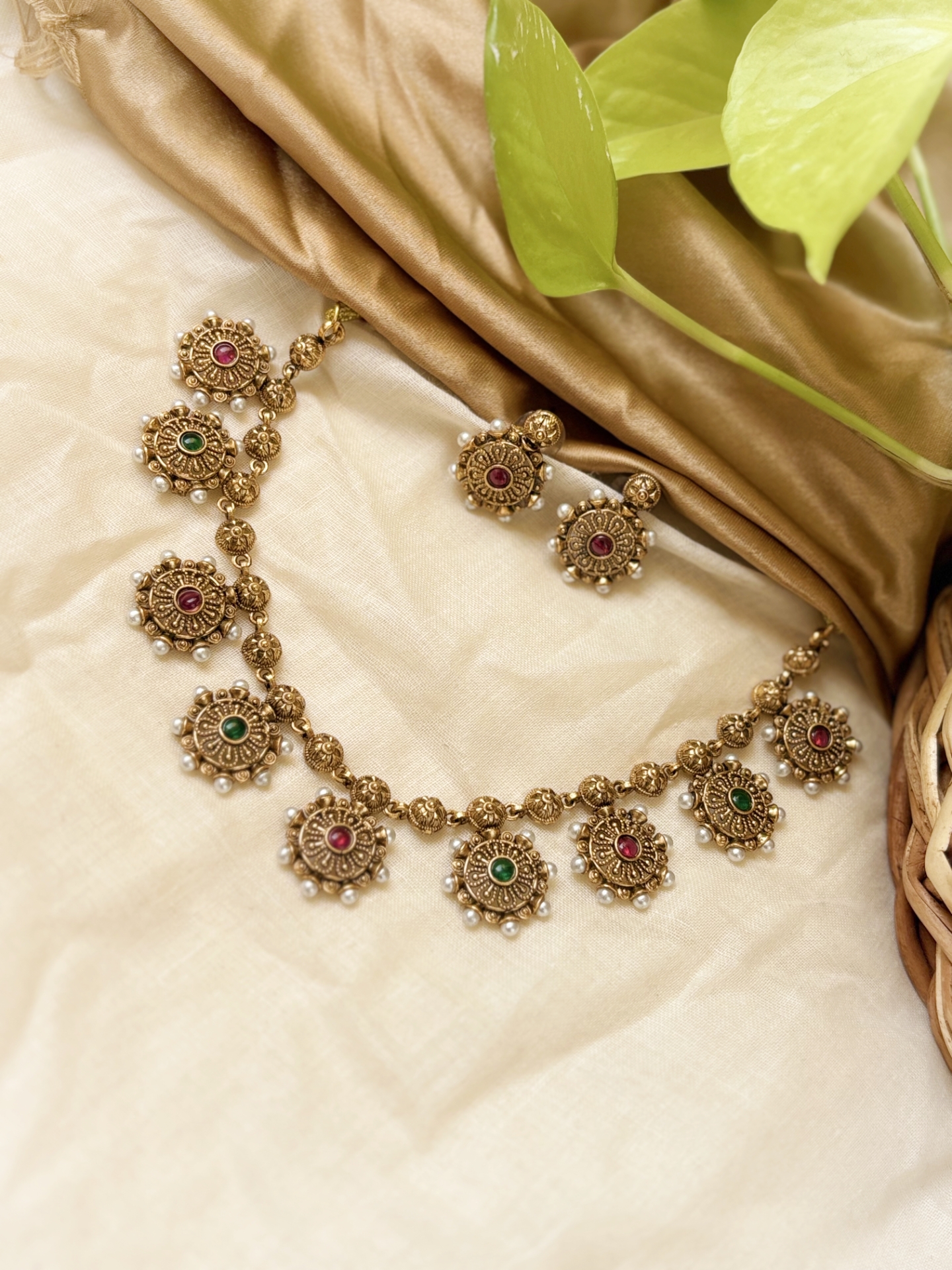 Featuring intricately carved coin-style motifs, each element is highlighted with rich ruby and emerald-tone stones at the center, surrounded by delicate pearl accents. The antique gold finish enhances its heritage appeal, making it a perfect choice for festive occasions, weddings, and traditional celebrations.