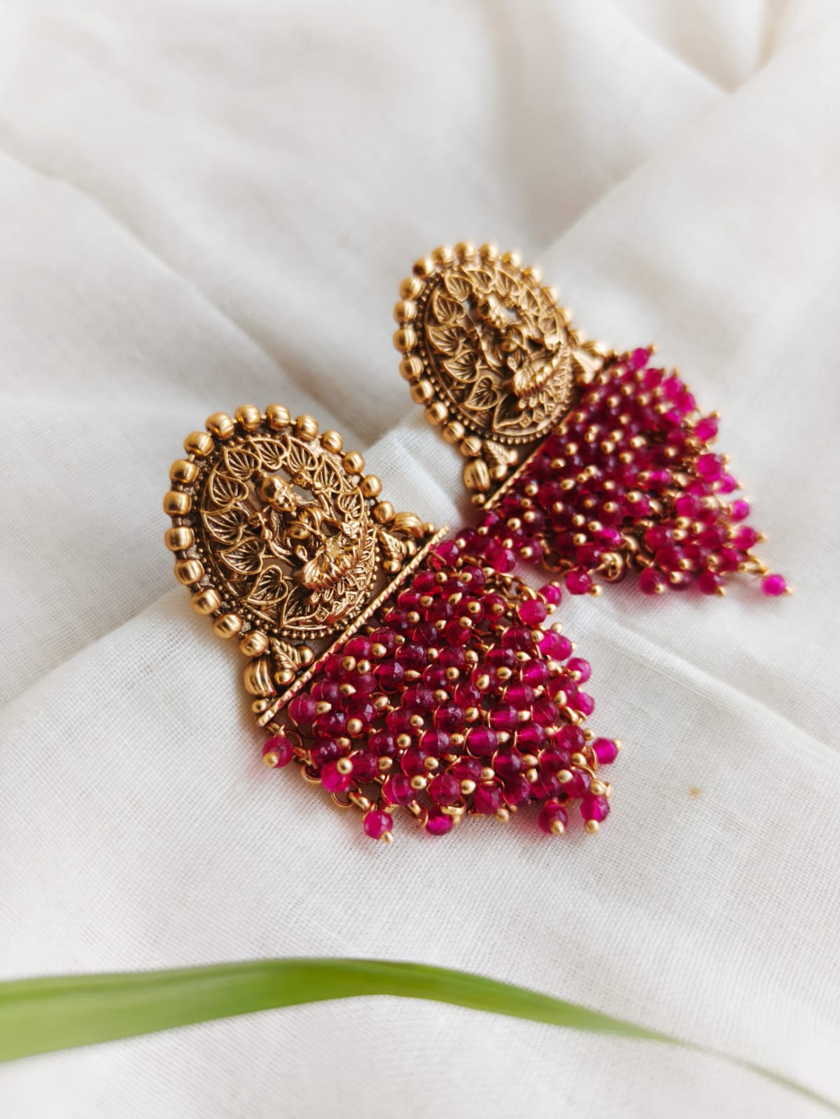 Elegant temple tassel earrings available in Ruby, Green, and White. Each pair features intricate deity motifs with delicate bead tassels — perfect for festive and wedding looks.