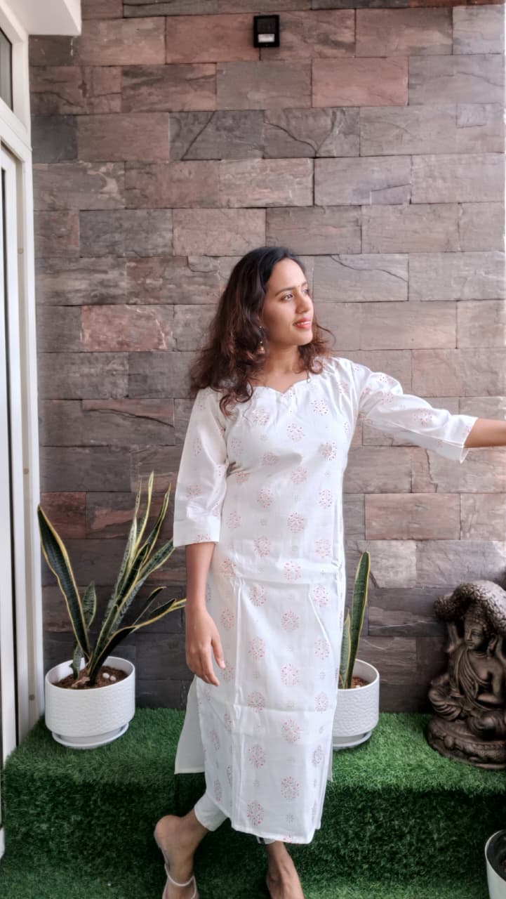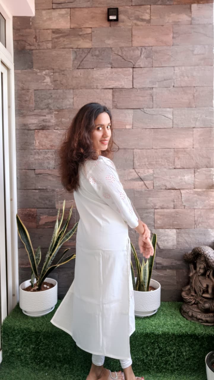 White cotton-silk kurta with Motif prints. Lightweight, elegant, and perfect for festive or everyday wear.