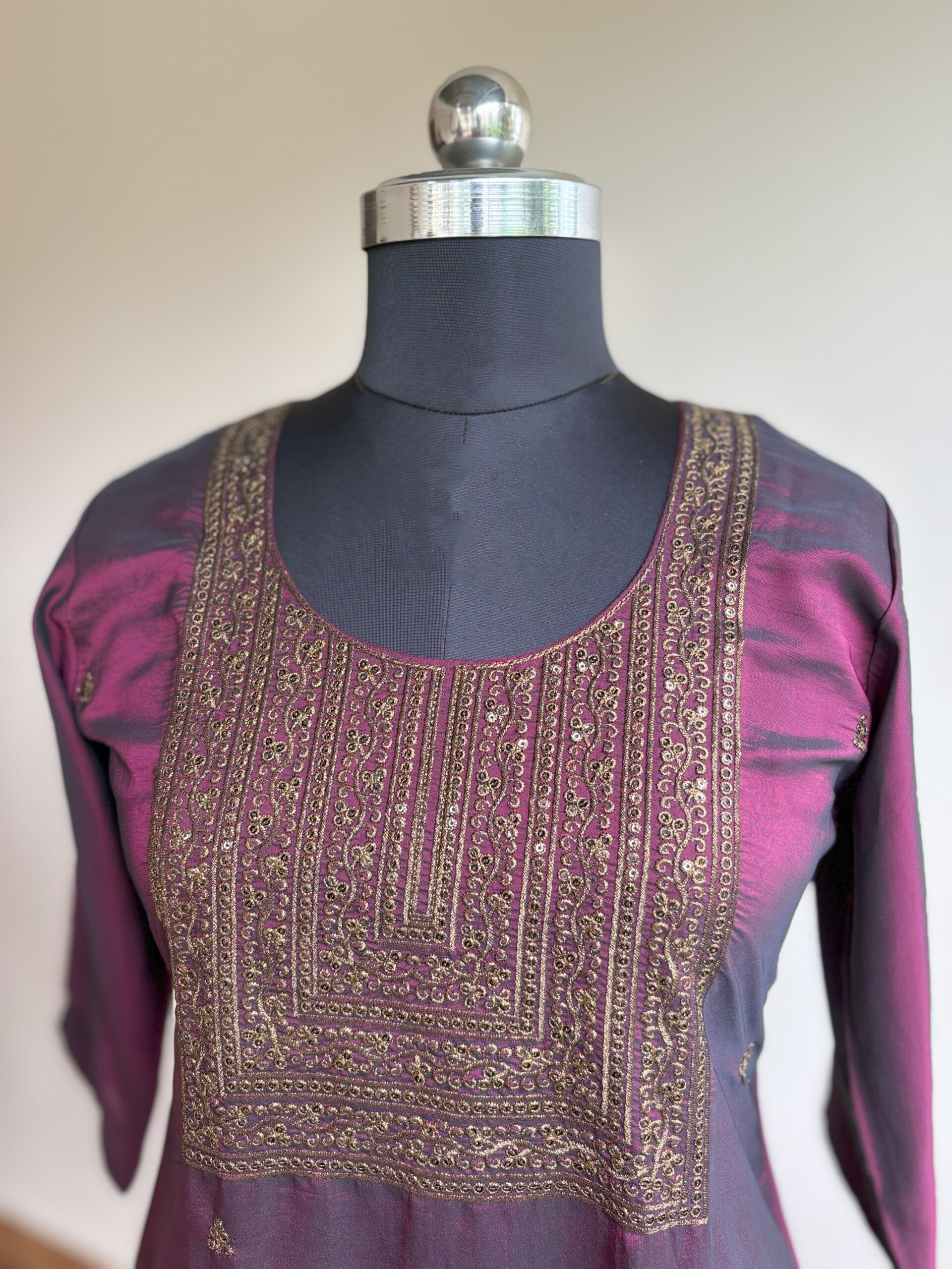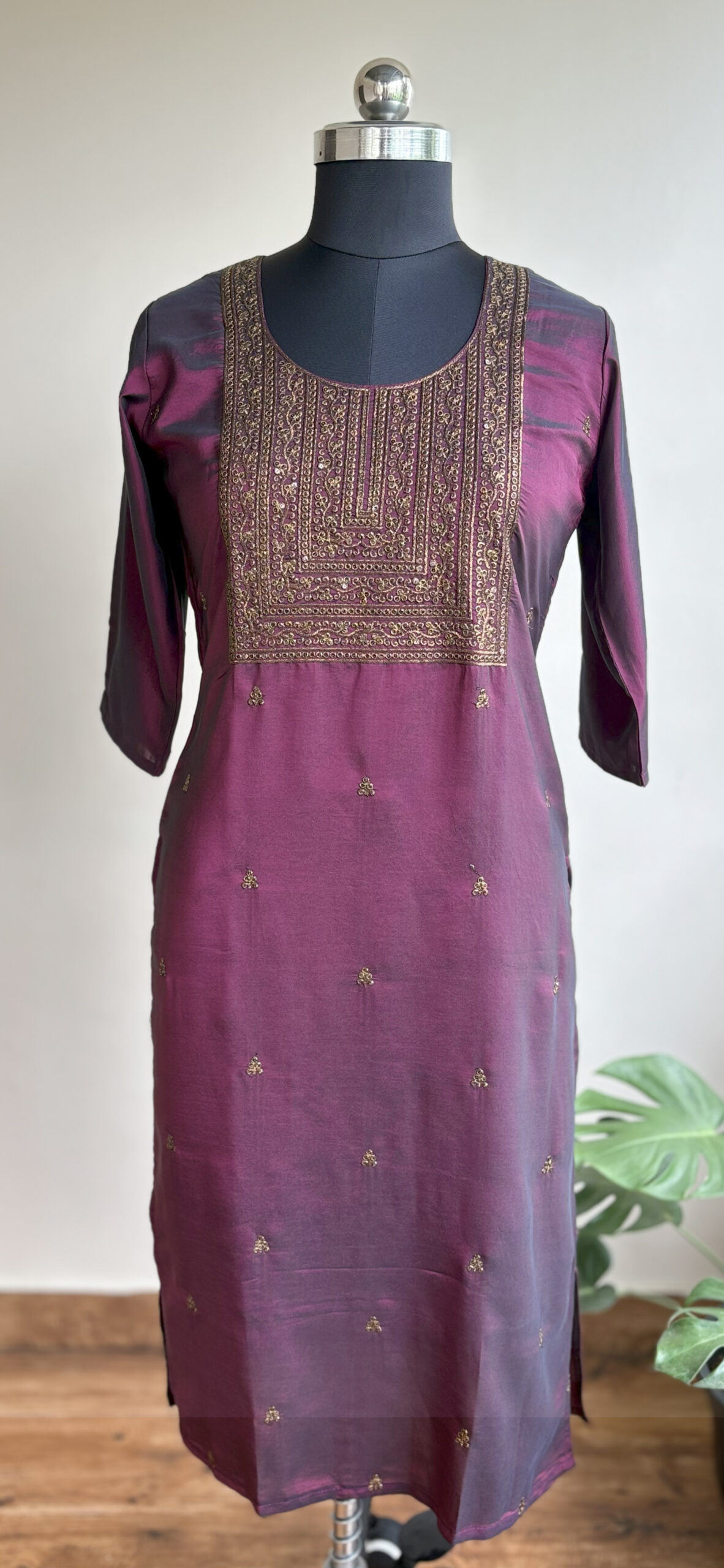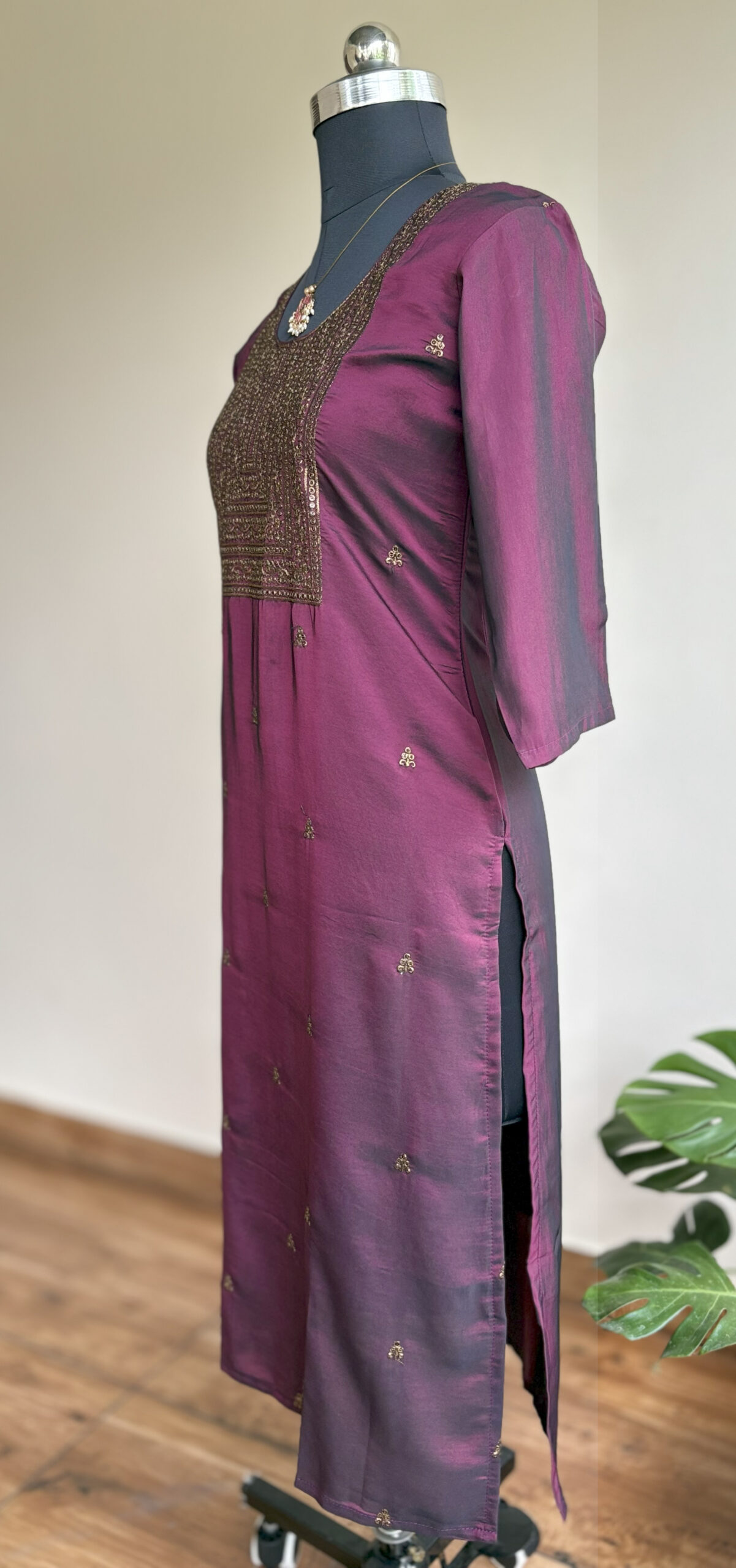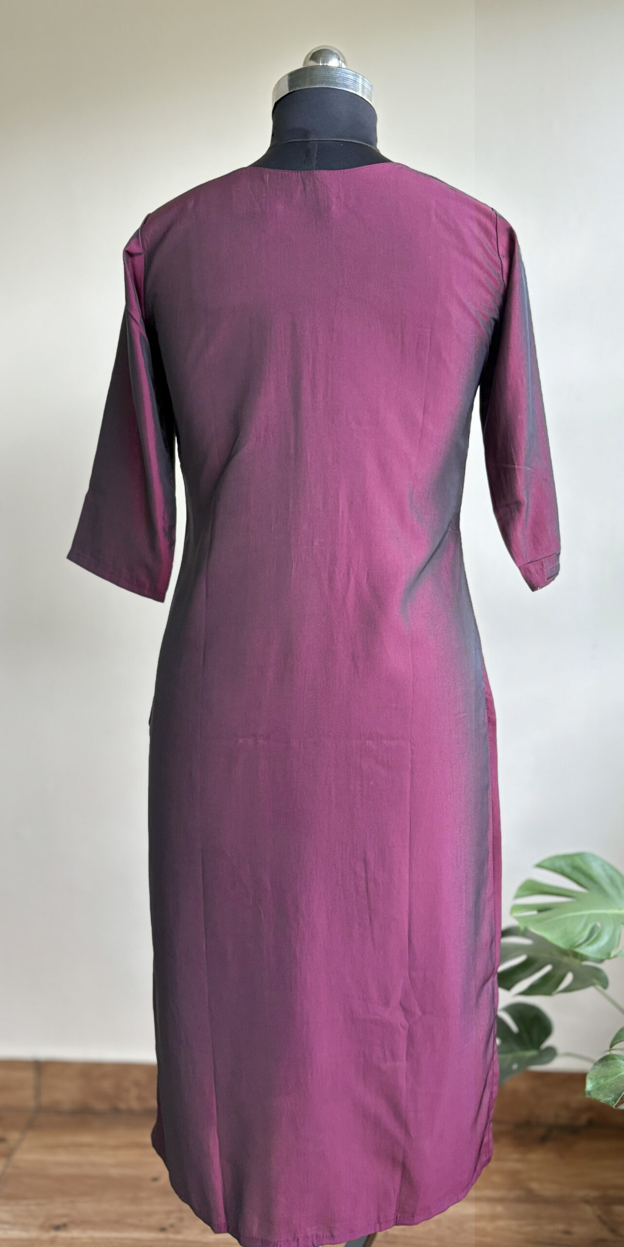 Graceful wine-colored silk cotton kurti with intricate embroidery. Perfect for festive occasions and elegant gatherings.